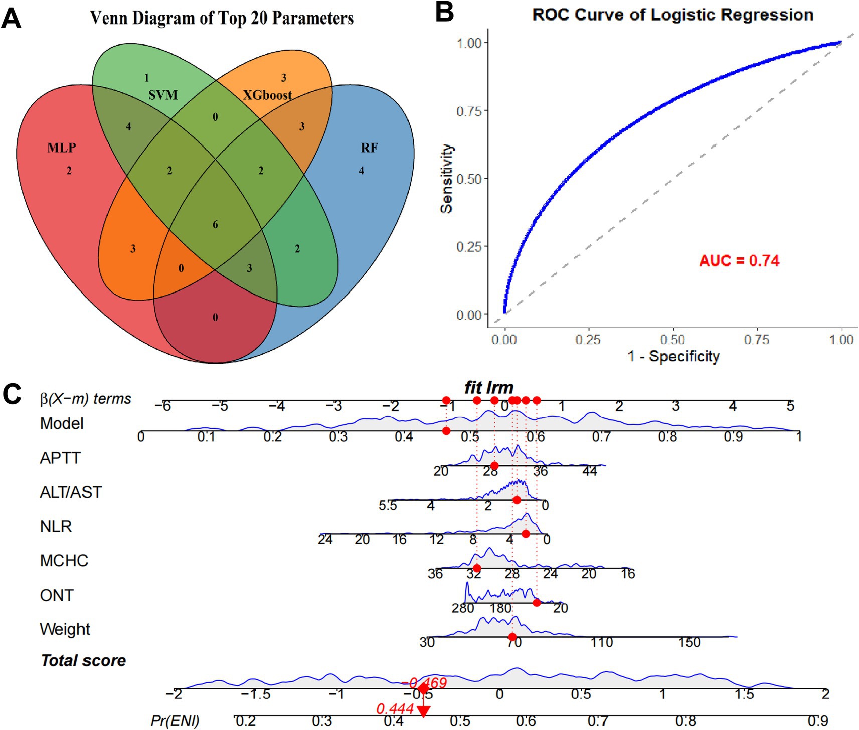 To further explore the predictive capacity of ML models for ENI, we employed four ML algorithms, including MLP, RF, SSVM, and XGBoost, using the common clinical data. By dividing the patients into an 8:2 training-to-testing ratio, the MLP model demonstrated the highest predictive performance with an AUC of 0.77 in the testing set, outperforming RF (0.72), SVM (0.63), and XGBoost (0.68). Subsequently, by intersecting the critical parameters selected by all four ML methods, we identified six common parameters (APTT, ALT/AST, ONT, MCHC, Weight, and NLR) that were then used to construct a logistic regression model. This refined model achieved an AUC of 0.74, indicating its robustness in predicting ENI. Notably, the nomogram based on these six parameters showed a markedly improved predictive performance compared to individual parameters, underscoring the value of this composite approach.