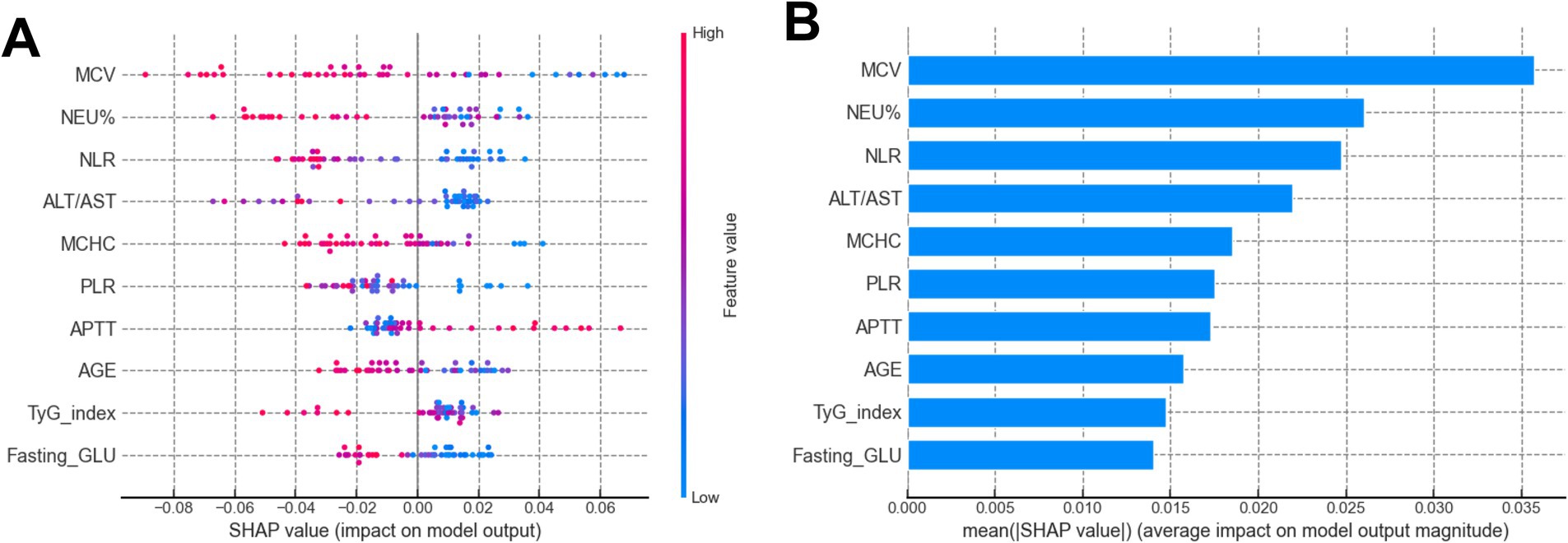 The SHAP analysis elucidated the direction and relative importance of predictive factors influencing ENI after thrombolysis, Figure 4 listed the SHAP summary plot of the top 10 features of the RF model. Among all models evaluated, APTT emerged as the most influential positive predictor, where higher values were consistently associated with better ENI outcomes, suggesting that moderately prolonged coagulation may facilitate neurorecovery post-thrombolysis. In contrast, ALT/AST ratio and MCHC demonstrated significant negative impacts across multiple models (MLP, RF, SVM, XGBoost), implying that liver dysfunction and increased blood viscosity may hinder neurological recovery. Additionally, NEU% and age was consistently associated with poorer ENI outcomes in RF, SVM, and XGBoost models, highlighting the detrimental effects of systemic inflammation and advanced age on prognosis. Notably, RBC and body weight showed positive associations in certain models (e.g., MLP, SVM), possibly reflecting beneficial hemodynamic effects. Conversely, ONT and fasting GLU levels were linked to unfavorable outcomes, underscoring the importance of timely intervention and metabolic control. In summary, APTT, ALT/AST, MCHC, NEU%, and age were identified as the most influential predictors, with their directional effects providing critical insights for risk stratification and personalized therapeutic strategies in thrombolysis management.