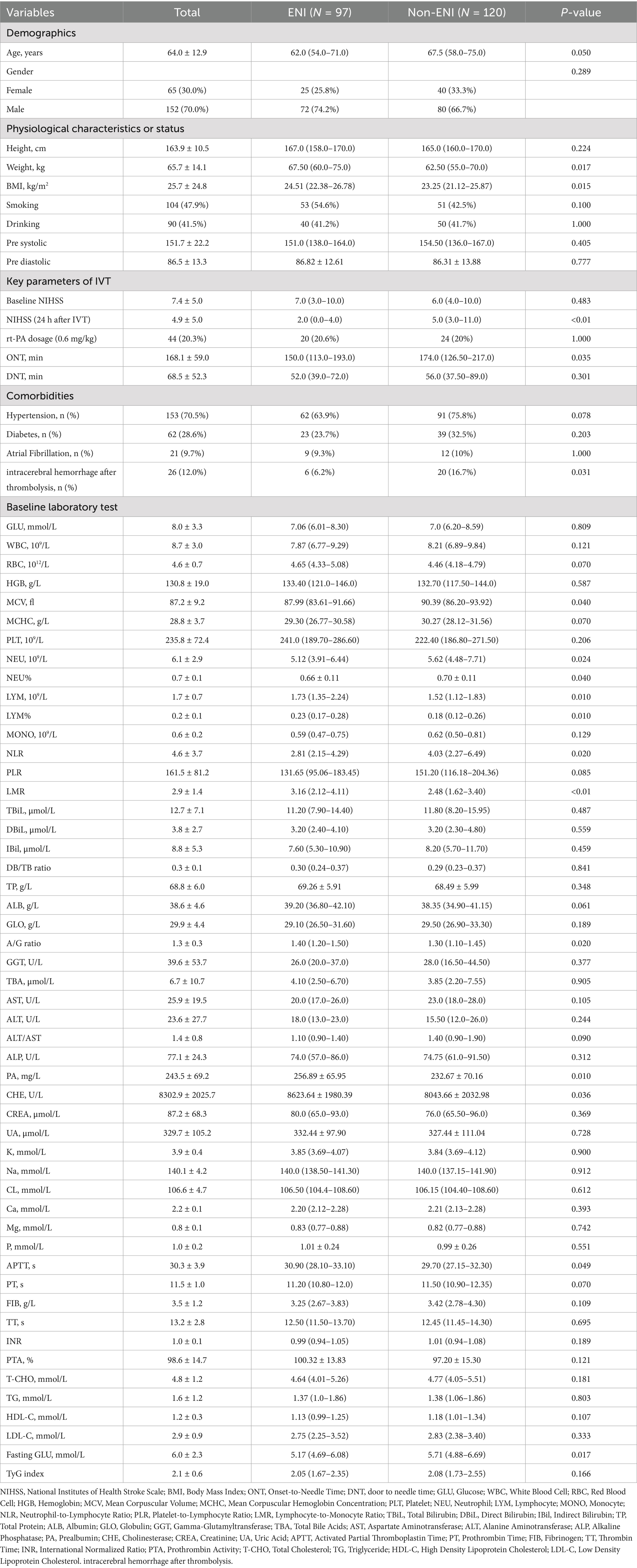 Table 1 summarizes the baseline characteristics of both groups. The study included 217 patients were divided into ENI group (n = 97) and non-ENI group (n = 120) based on the achievement of ENI. Baseline characteristics comparison revealed that ENI group patients were younger (mean age 62 vs. 67.5 years) with a higher proportion of males (74.2% vs. 66.7%). There was significantly shorter onset-to-treatment time in ENI group compared with non-ENI group (150 vs. 174 min). Lower value of NEU (5.12 vs. 5.62), NEU% (66% vs. 70%) and NLR (2.81 vs. 4.03). Higher LYM (0.23 vs. 0.18), LYM% (1.73 vs. 1.52), LMR (3.16 vs. 2.48), MCV (87.99 vs. 90.39), and Fasting GLU (5.17 vs. 5.71) were found in ENI group than in non-ENI group (p < 0.05). However, higher value of weight (67.5 vs. 62.5), BMI (24.51 vs. 23.25), APTT (30.9 vs. 29.7), A/G ratio (1.40 vs. 1.30), PA (256.89 vs. 232.67), and CHE (8623.64 vs. 8,043) were found in ENI group than in non-ENI group (p < 0.05). However, no significant differences were found in resting indexes (p > 0.05). These findings suggest that younger age, shorter thrombolysis time window, reduced inflammatory status, better nutritional/metabolic condition, and appropriate anticoagulation status may be closely associated with early neurological improvement following intravenous thrombolysis.