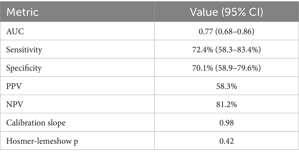 To refine the predictive model, we identified the top 20 parameters from each of the four ML models and overlapped them, resulting in six common parameters: APTT, ALT/AST, ONT, MCHC, Weight, and NLR (Figure 3A). The VIF value for each parameter was APTT: 1.32; ALT/AST: 1.45, ONT: 1.28, MCHC: 1.36, Weight: 1.30, and NLR: 1.41. This conservative selection reduced the feature space from near 70–6, yielding an events-per-variable (EPV) ratio of 16.2, which supports model stability. A logistic regression model was then constructed using these six parameters, yielding an AUC value of 0.74 (Figure 3B), which indicates moderate predictive performance. A nomogram was developed to visualize the predictive value of the model relative to the six parameters (Figure 3C), demonstrating that the composite model outperformed individual parameters in predicting ENI, with a bootstrap-corrected C-index of 0.817. these results suggesting that this model show good predictive accuracy for ENI in rt-PA-treated AIS patients. The sensitivity, specificity, PPV, NPV at optimal threshold were listed in Table 3.
