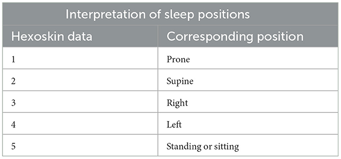 Acquisition devices were fixed in a determined orientation inside the Hexoskin shirt pocket. We added Velcro tape strips to ensure immobility during position changes. The device was positioned following orientation recommendations indicated by the manufacturer: the device positioned on its side, with LED lights facing away from the body and device connector cable pointing upwards (Figure 1). As the device was replaced regularly to transfer the data, instructions were given to technicians and other staff to place the device in the same predetermined position. Each was asked to show the device placement on camera and report the position during each visit to ensure consistency. Data from patients were eligible for analysis if the shirt was worn correctly and the accelerometer device was correctly positioned upon inspection by the data acquisition team. Hexoskin data collected each day, excluding on nights of sleep deprivation, were downloaded as comma-separated value (CSV) files including timestamps for sleep position changes. Sleep positions were interpreted using a chart provided by Hexoskin, from sleep onset (intention to sleep) to offset (intention to wake), each based on video recordings (Table 1).