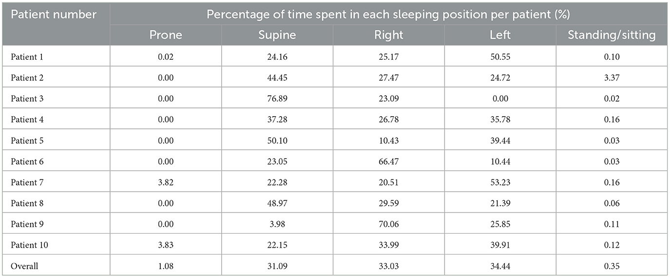 Results: Across 10 patients and 347 h of sleep analyzed, 65% of prone, 75% of supine, 94% of right lateral decubitus, 81% of left lateral decubitus, and 65% of sitting/standing positions were correctly classified by the Hexoskin algorithm. Balanced accuracy was 0.76 and weighted F1-score was 0.85.