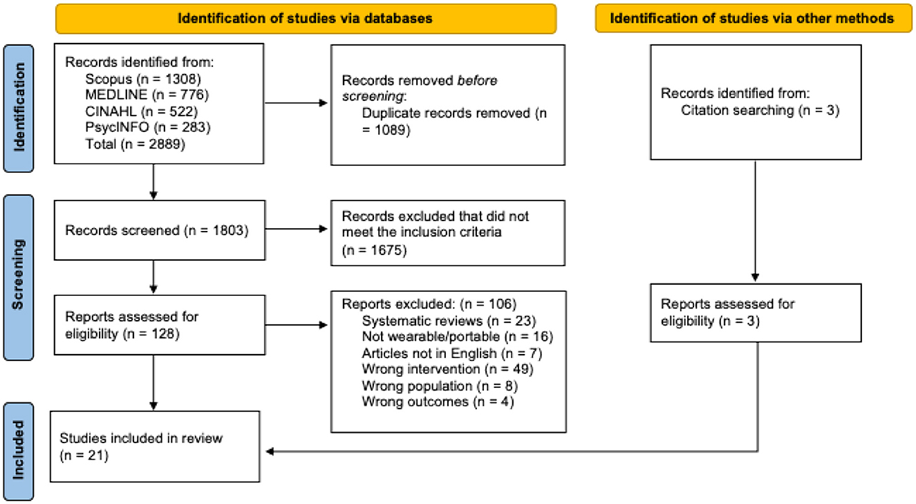 A total of 2,889 articles were identified across the databases searched, with an additional 3 articles located through citation searching. After removing 1,089 duplicates, 1,803 articles remained for title and abstract screening. Of these, 1,675 were excluded for not meeting the eligibility criteria. The remaining 131 articles underwent full-text review, resulting in 21 studies that met the inclusion criteria and were included in the synthesis (Figure 1).