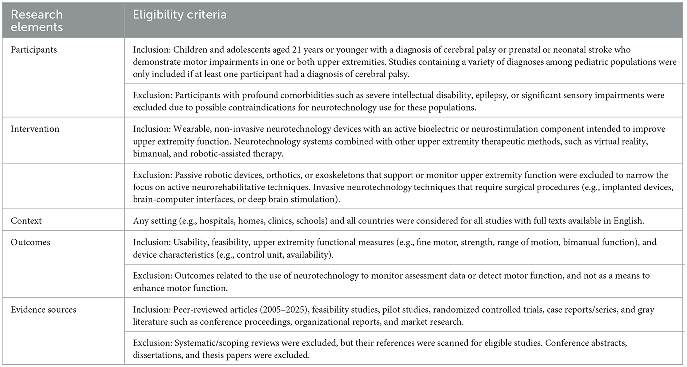 Methods: This review followed the JBI Scoping Review Methodology and PRISMA-ScR guidelines. Four electronic database sources, MEDLINE, Scopus, CINAHL, and PsycINFO, were systematically searched to identify studies on wearable neurotechnology devices for upper extremity rehabilitation in children with cerebral palsy. Included studies consisted of journal articles published from January 2005 to June 2025, with full texts available in English and relevant gray literature sources. Data were extracted on neurotechnology characteristics, regulatory status, intervention protocols, and outcome measures.