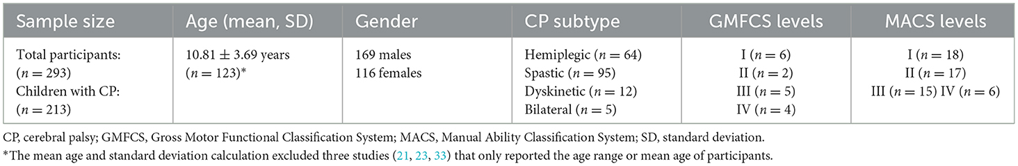 Across the 21 included studies, a total of 293 participants were reported. This sample comprised 213 children with CP (ages 4–19) and 13 healthy controls. One study included both children and adults with CP (ages 9–38) (33), while another enrolled adults as healthy controls (26). In addition, eight studies included participants with other diagnoses, which contributed to the overall sample size (22, 24–27, 30, 33, 36). Gender was reported for most participants, with 169 males (59.3%) and 116 females (40.7%). Thirteen studies reported CP subtypes, including hemiplegic CP (n = 64), spastic CP (n = 95), dyskinetic CP (n = 12), and bilateral CP (n = 5) (21, 23, 24, 28–32, 35, 37–41). Several studies also reported motor impairment severity using the Manual Ability Classification System (MACS) and Gross Motor Function Classification System (GMFCS), with distributions summarized in Table 2.