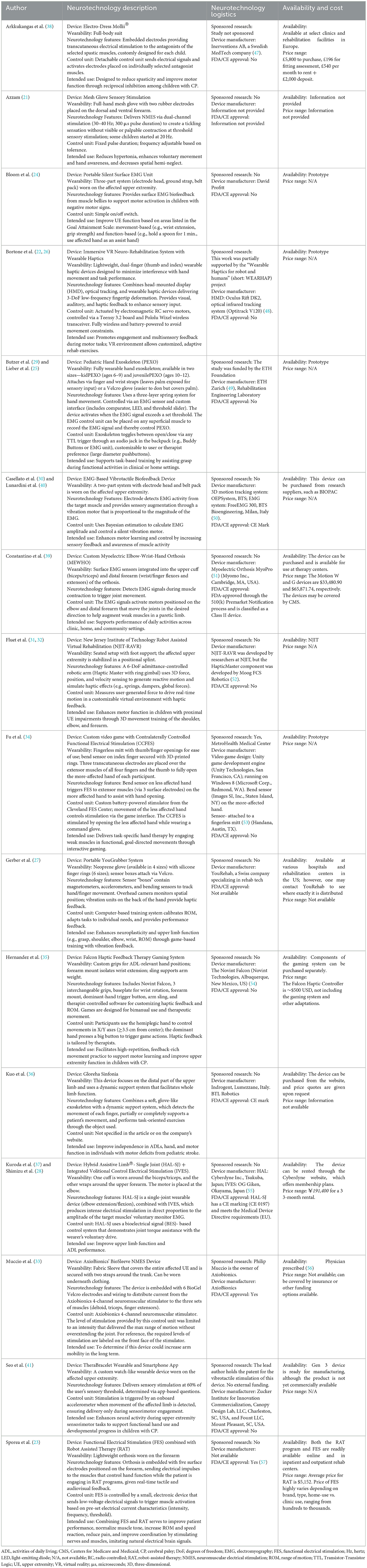 While previous studies have shown wearable devices to improve upper extremity performance in adults with upper motor neuron injuries, there is limited synthesized research on the types of wearable neurotechnology available for children with CP and their effects on upper extremity outcomes (13, 15, 16). Furthermore, pediatric studies often lack clear and consolidated information regarding device specifications, training models, and outcomes relevant to clinical practice (10). These gaps complicate decision-making for clinicians seeking to adopt innovative approaches to neurorehabilitation in children with CP. Emerging wearable neurotechnology systems that facilitate movement with electrical stimulation, electromyography (EMG) biofeedback, or haptic feedback hold the potential to reshape pediatric neurorehabilitation and enhance volitional motor control. These devices could significantly impact the quality of life in children with CP by facilitating increased movement and use of the upper extremities, leading to increased independence and participation in meaningful occupations (17).