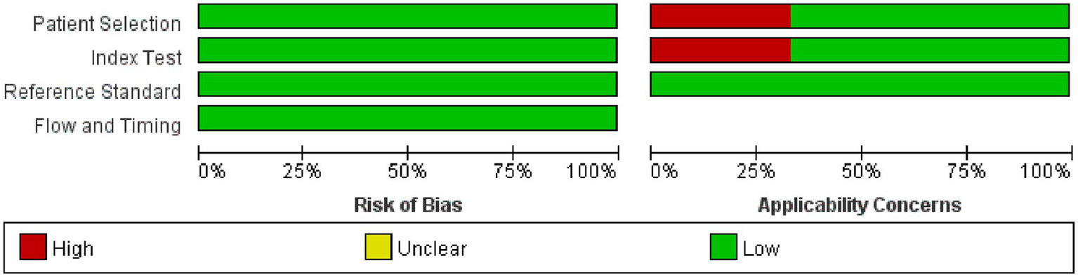 The risk of bias and applicability of the included studies were evaluated by adopting the QUADAS-2 tool (14). This tool evaluates four domains: patient selection, index test, reference standard, and flow and timing. Each domain contains specific questions answered as “Yes,” “No,” or “Uncertain,” corresponding to a judgment of bias risk as “Low,” “High,” or “Uncertain,” respectively. Studies are considered at low risk of bias if all signaling questions in each domain are answered with “Yes.” Any “No” among the answers to the signaling questions indicates potential bias, and the evaluator must then judge the risk of bias according to the guidelines provided. An “Uncertain” rating refers to situations with insufficient information for a definitive judgment.