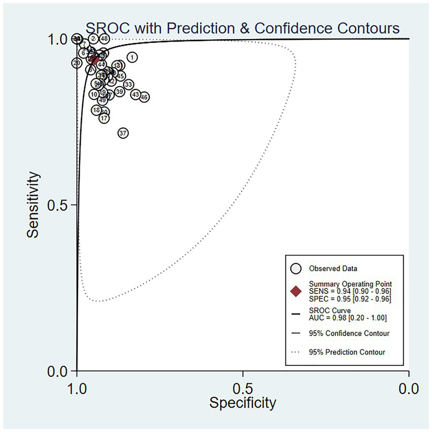 A total of 39 original studies were ultimately included, all of which constructed DL images derived from electrocardiogram (ECG) images. Our meta-analysis results suggested that for the comprehensive validation set, the sensitivity, specificity, diagnostic odds ratio (DOR), and the area under summary receiver operating characteristic (SROC) curve were 0.93 (95% CI: 0.90–0.96), 0.95 (95% CI: 0.92–0.96), 252 (95% CI:116–549), and 0.98 (95% CI: 0.42–1.00), respectively. For the independent validation set, the sensitivity, specificity, and SROC curve were 0.93 (95% CI: 0.88–0.96), 0.95 (95% CI: 0.92–0.97), and 0.98 (95% CI: 0.42–1.00), respectively. For the K-fold cross-validation set, the sensitivity, specificity, positive likelihood ratio (LR), and SROC curve were 0.94 (95% CI: 0.88–0.97), 0.94 (95% CI: 0.89–0.96), 15.0 (95% CI: 8.1–27.6) and 0.98 (95% CI: 0.65–1.00), respectively.