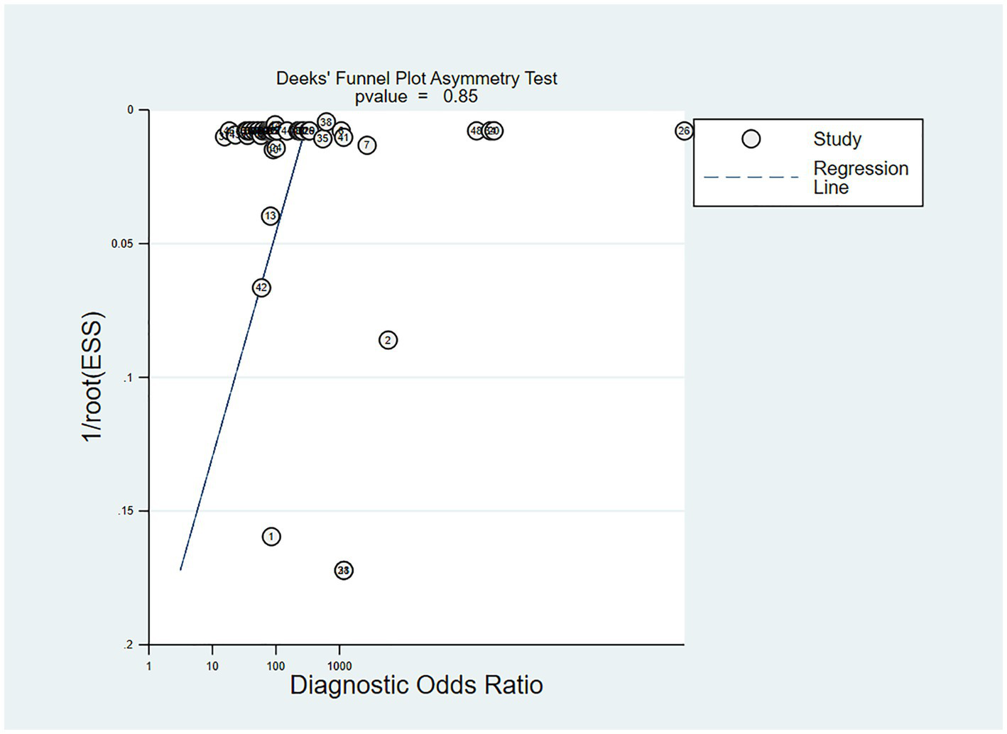 Data analysis was performed utilizing Stata 15.0. A bivariate mixed-effects model was employed for the meta-analysis. Pooled estimates of sensitivity, specificity, Positive likelihood ratio (PLR), Negative likelihood ratio (NLR), Diagnostic odds ratio (DOR), and corresponding 95% CIs, were calculated using this model. The area under the SROC curve was also estimated. Deek’s funnel plot was adopted to assess publication bias. Additionally, a nomogram was employed to evaluate the clinical applicability of DL. Throughout the analysis, the prevalence of OSA in the studies included was used as the prior probability. Furthermore, we conducted subgroup analyses on the methods of validation set generation (independent validation and k-fold cross-validation). p < 0.05 was deemed statistically significant.
