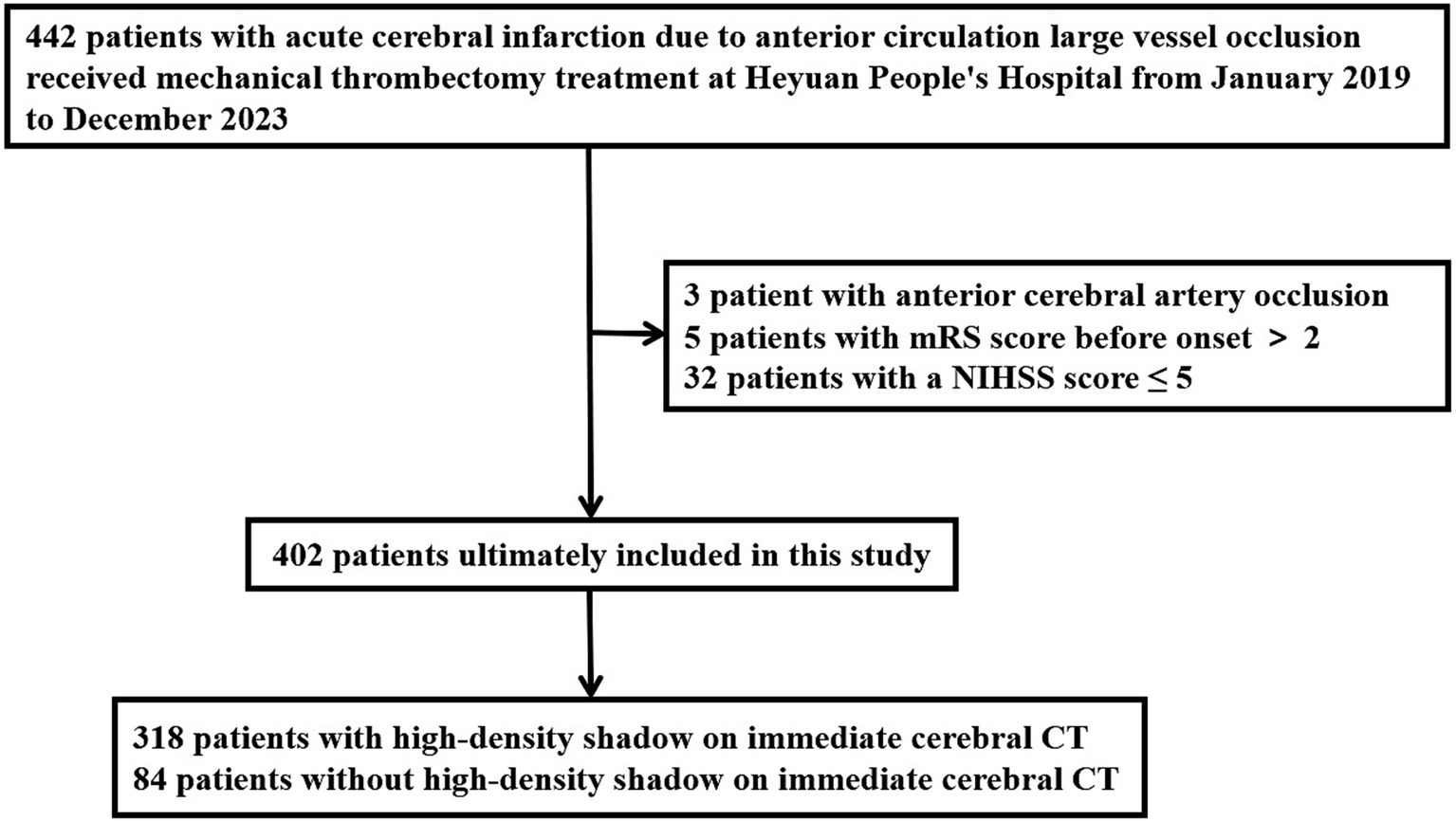 Methods: A retrospective analysis was conducted on patients with acute ischemic stroke due to anterior circulation large vessel occlusion who received interventional recanalization from January 2019 to December 2023 in Heyuan People’s Hospital. The main inclusion criteria included NIHSS score ≥ 6 points at the time of onset, the time from onset to femoral artery puncture ≤ 24 h and so on. The main exclusion criteria included pre onset mRS score > 2 points, the vital signs were unstable during the onset of the disease and so on. Variables we studied included NIHSS score at admission, preoperative ASPECT score, blood flow reperfusion eTICI grading, surgical methods and so on. According to the distribution, density, volume, etc. of cerebral hyperdensity, high-density shadow was divided into cortical type, soft type, metallic type, and diffuse type.