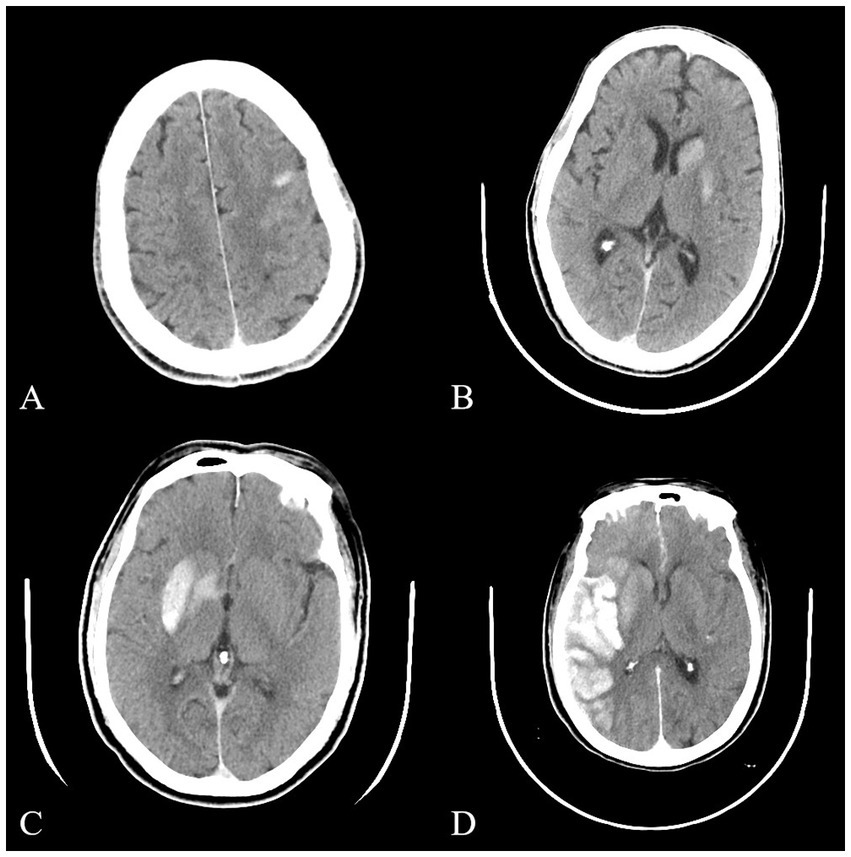 Figure 2. Typical images of four types of high-density shadow on immediate cerebral CT after successful interventional recanalization. (A) Cortical high-density shadow; (B) Soft high-density shadow; (C) Metal high-density shadow; (D) Diffuse high-density shadow. CT, computed tomography.
