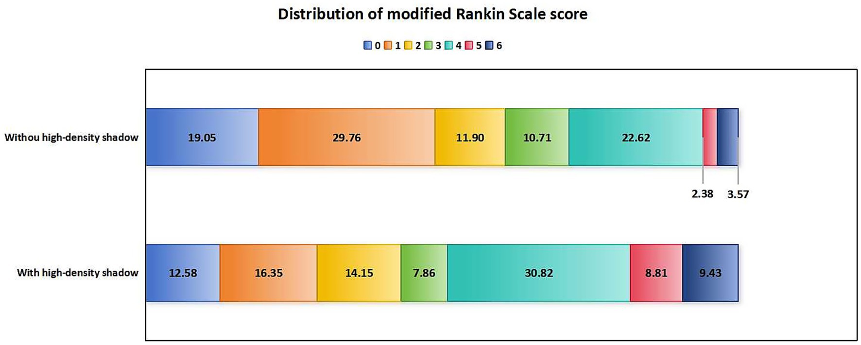 Figure 3. Distribution of mRS scores in patients with and without high-density shadow on immediate cerebral CT 3 months after successful interventional recanalization. mRS, modified Rankin Scale; CT, computed tomography.
