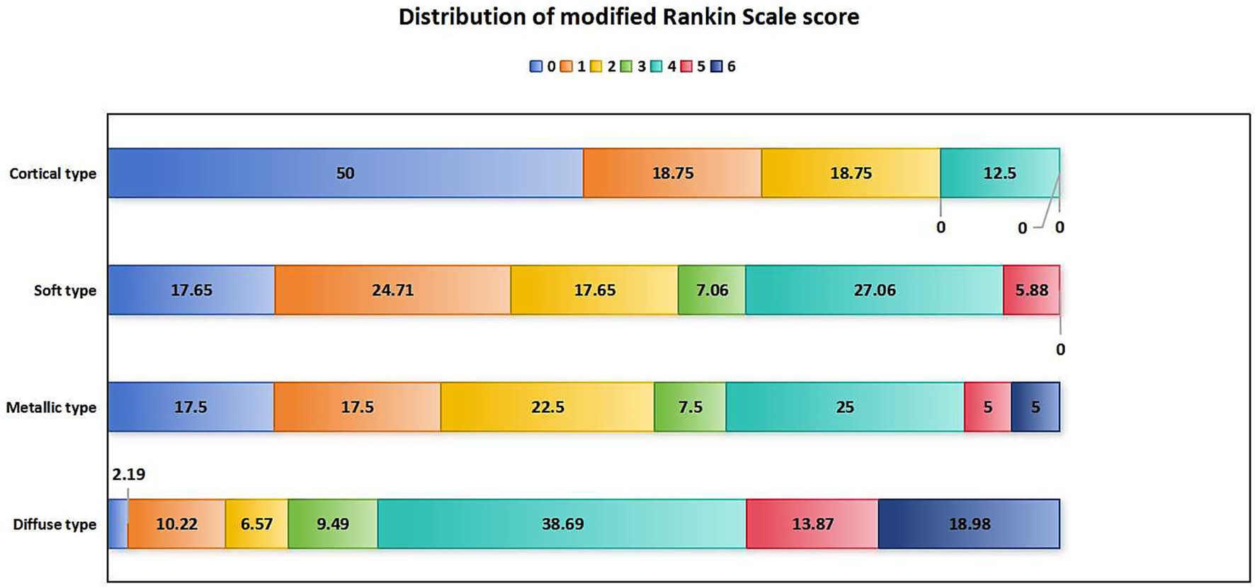 In terms of prognosis and complications, patients with diffuse high-density shadow had the highest mRS score, highest incidence of futile recanalization, symptomatic intracranial hemorrhage and malignant brain edema, highest mortality rate within 3 months after surgery, and lowest proportion of mRS ≤ 1 was at 3 months after surgery (p < 0.05). The mRS score, incidence of futile recanalization, symptomatic intracranial hemorrhage and malignant brain edema were the lowest and proportion of mRS ≤ 1 was the highest in patients with cortical high-density shadow at 3 months after surgery (p < 0.05). The comparison of prognosis and complications of four types of high-density shadow of patients are shown in Table 5. The distribution of mRS scores of four types of high-density shadow of patients at 3 months after surgery is shown in Figure 4.