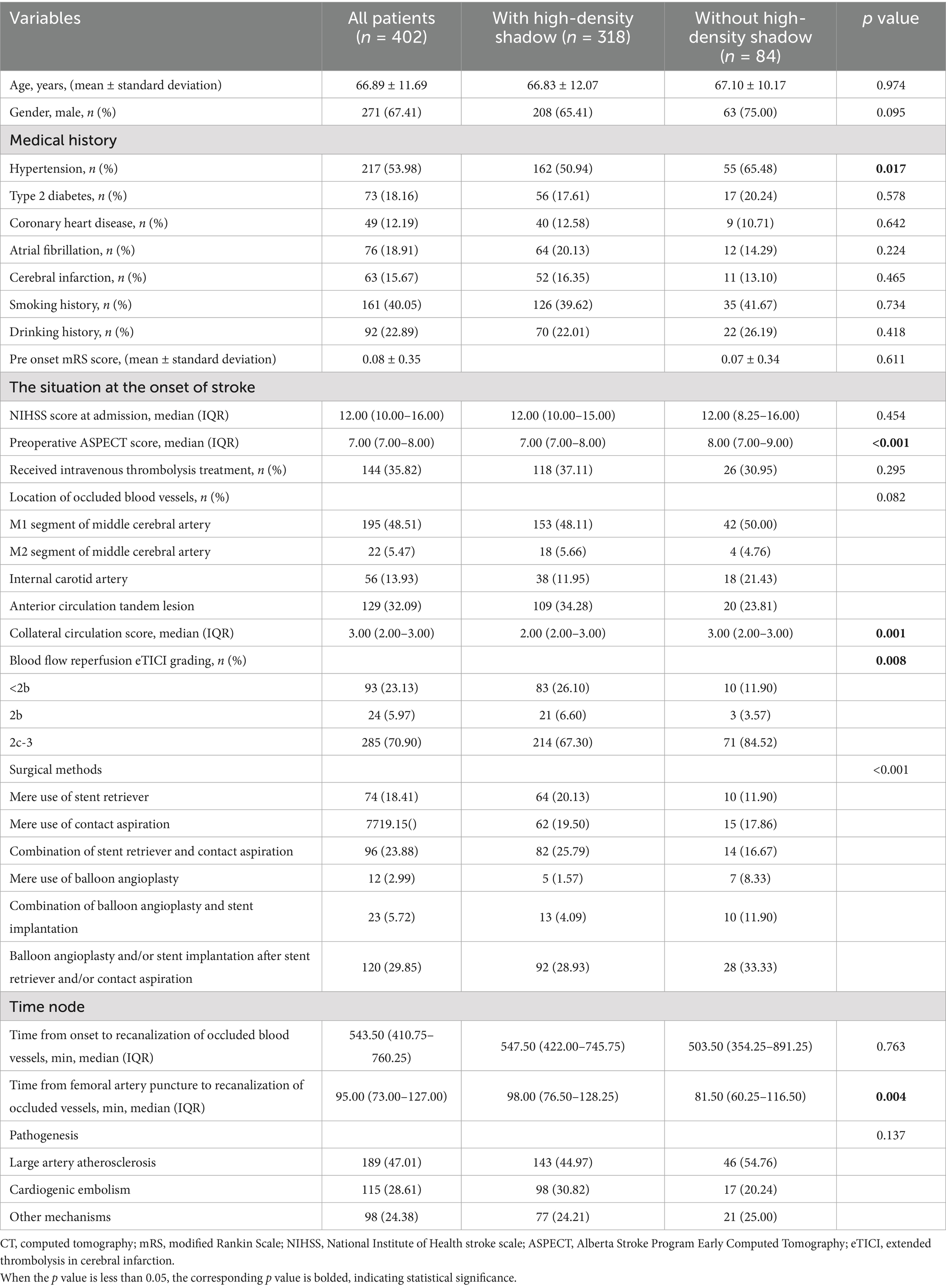 We included a total of 402 patients, according to whether there was a high-density shadow on the immediate cerebral CT after successful interventional recanalization, the patients were divided into a group with high-density shadow and a group without high-density shadow, with 318 cases (79.10%) in the high-density shadow group and 84 cases (20.90%) in the without high-density shadow group. There were statistically significant differences (p < 0.05) in hypertension, preoperative ASPECT score, collateral circulation score, surgical methods and time from femoral artery puncture to recanalization of occluded vessels between the two groups of patients. Compared with the group without high-density shadow, patients in high-density shadow group had a lower rate of history of hypertension, lower preoperative ASPECT scores, lower proportion of mere use of balloon angioplasty, lower proportion of combination of balloon angioplasty and stent implantation and longer time from femoral artery puncture to recanalization of occluded vessels. There was no statistical difference between the two groups in age, sex, history of diabetes, history of coronary heart disease, history of atrial fibrillation, history of cerebral infarction, history of smoking, history of drinking, pre onset mRS score, rate of receiving intravenous thrombolysis treatment, location of occluded vessels, time from onset to recanalization of occluded vessels, and pathogenesis (p > 0.05). The baseline clinical data of two groups of patients with and without high-density shadow on immediate cerebral CT after successful interventional recanalization are shown in Table 1.