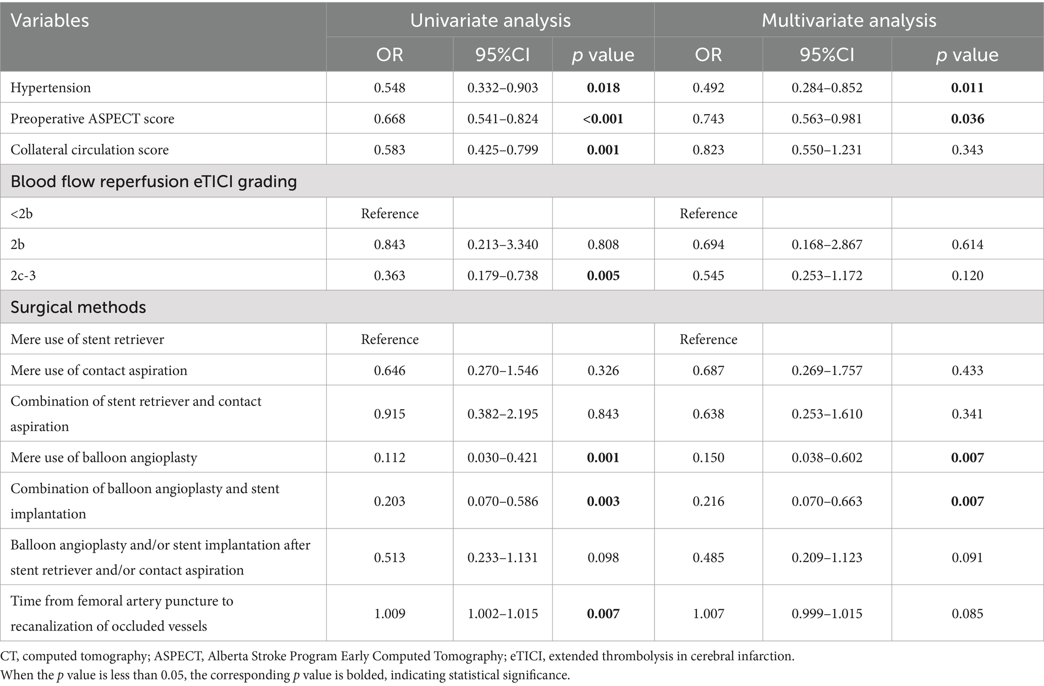 3.2 Univariate and multivariate logistic regression analysis of factors related to high-density shadow on immediate cerebral CT after successful interventional recanalization