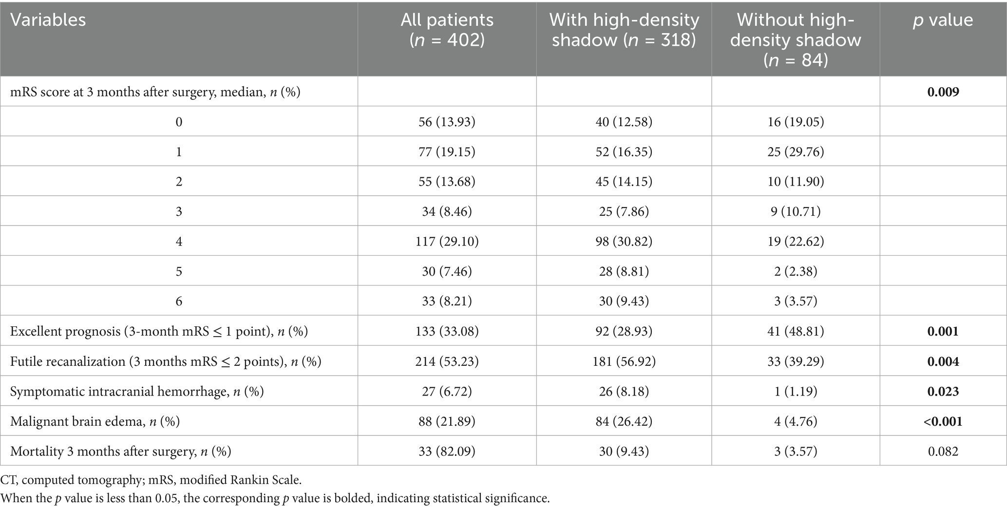 In terms of prognosis and complications, compared with patients without high-density shadow, patients in the high-density shadow group had higher mRS scores, higher incidence of futile recanalization, symptomatic intracranial hemorrhage and malignant brain edema, higher mortality rate within 3 months after surgery, and a lower proportion of mRS ≤ 1 at 3 months after surgery (p < 0.05). The comparison of prognosis and complications between the two groups of patients is shown in Table 3. The distribution of mRS scores between the two groups of patients 3 months after surgery is shown in Figure 3.