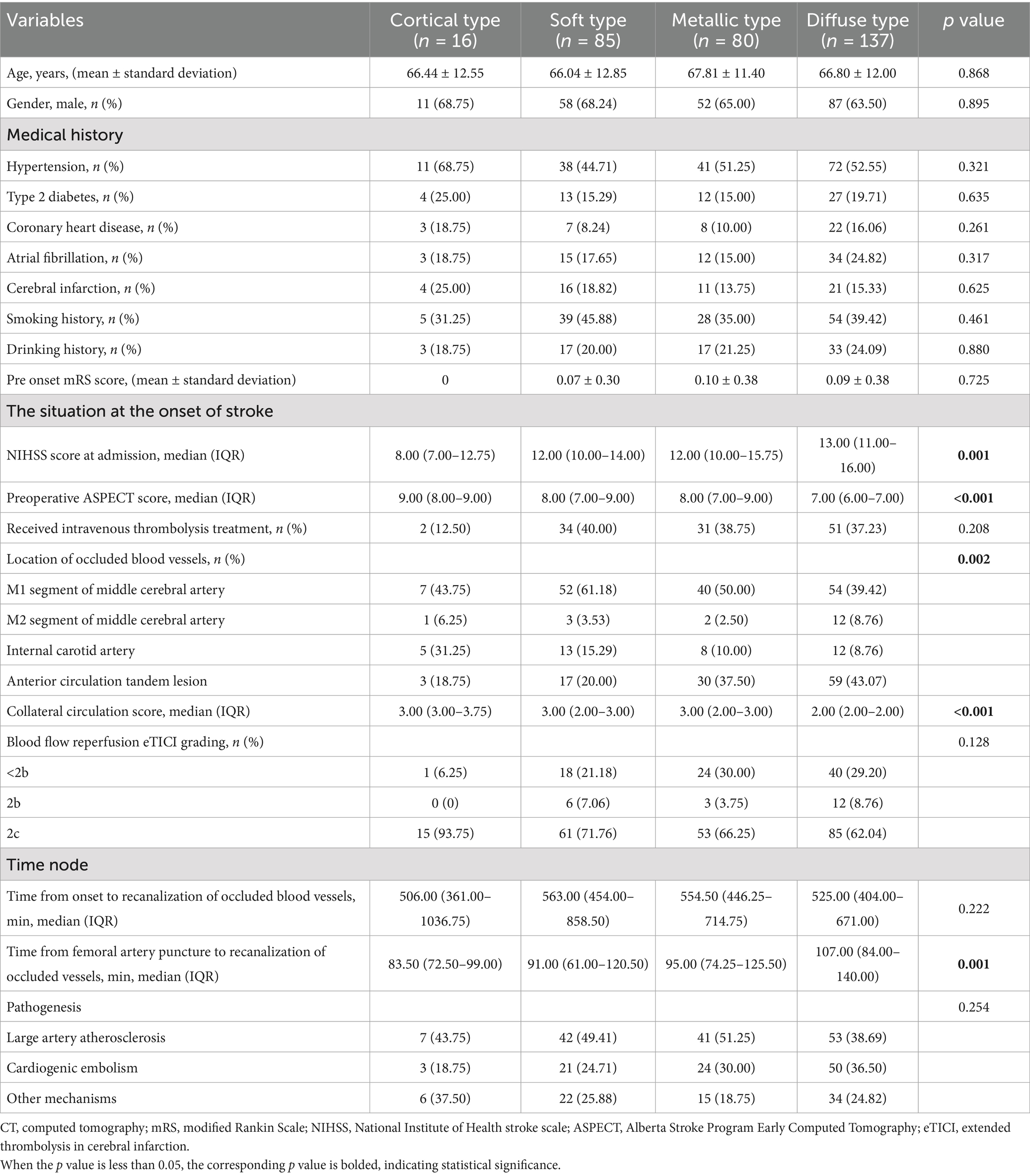 Table 4. Comparison of baseline clinical data in patients of four types of high-density shadow on immediate cerebral CT after successful interventional recanalization.