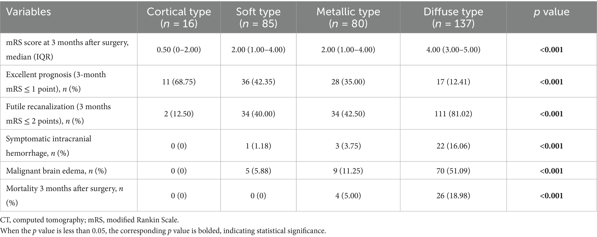 The high-density shadow on immediate cerebral CT after successful interventional recanalization were divided into four types: cortical type in 16 cases (5.03%), soft type in 85 cases (26.73%), metallic type in 80 cases (25.16%), and diffuse type in 137 cases (43.08%). There were statistically significant differences (p < 0.05) in NIHSS score at the time of onset, preoperative ASPECT score, and collateral circulation score among the four types of high-density shadow of patients. There was no significant difference in age, sex, hypertension, diabetes, coronary heart disease, atrial fibrillation, cerebral infarction, smoking, drinking, pre onset mRS score, rate of receiving intravenous thrombolysis treatment, location of occluded vessels, time from onset to recanalization of occluded vessels, time from femoral artery puncture to recanalization of occluded vessels, and pathogenesis among four types of high-density shadow of patients (p > 0.05). The baseline clinical data of four types of high-density shadow of patients are shown in Table 4.