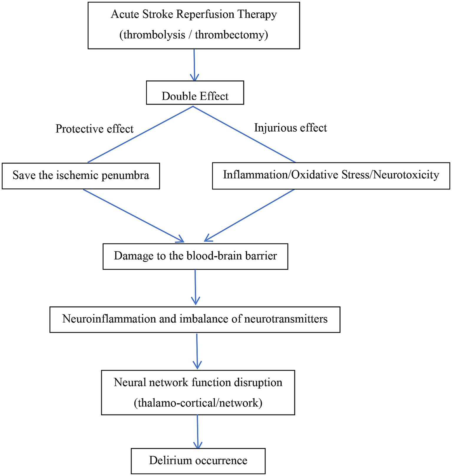Although delirium arises from diverse etiologies, its clinical manifestations are often similar, implying a shared underlying pathogenesis. However, the precise mechanisms of delirium remain incompletely understood. Most scholars believe that the occurrence of delirium after acute stroke reperfusion therapy may be related to multiple pathophysiological mechanisms. The primary hypotheses are as follows: