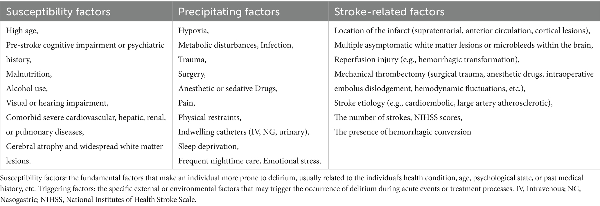 The possible risk factors for the occurrence of delirium after reperfusion therapy for acute stroke, including susceptibility factors, inducing factors and stroke-related factors were showed in Table 1.