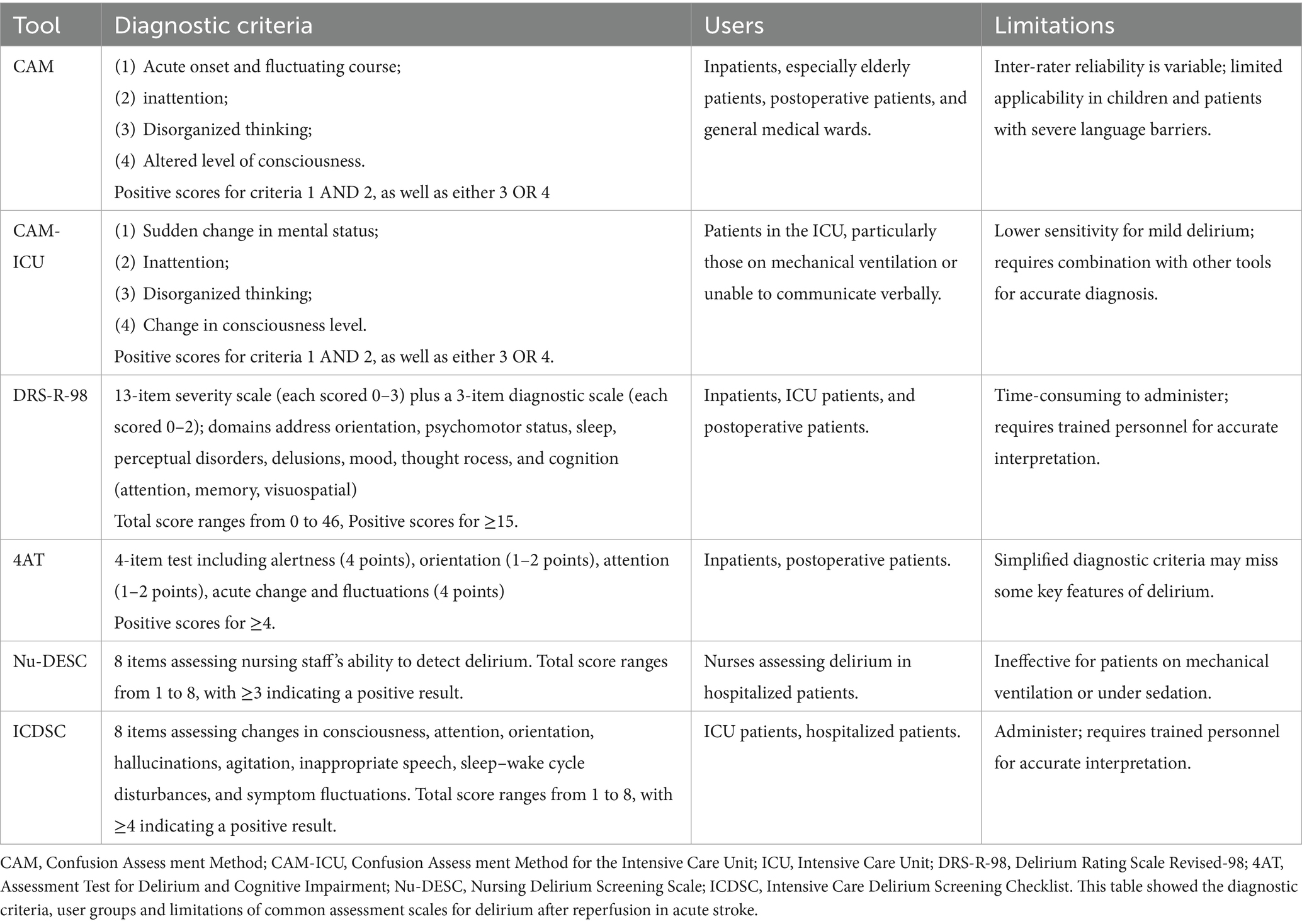 The Nursing Delirium Screening Scale (Nu-DESC) is a nurse-administered delirium screening tool suitable for hospitalized patients, with a sensitivity of 29–95% and a specificity of 69–90%. However, it is not applicable to patients with endotracheal intubation (52). The Intensive Care Delirium Screening Checklist (ICDSC) is a delirium screening tool specifically designed for ICU patients, applicable to both hospitalized and ICU settings, with a sensitivity of 74–99% and a specificity of 64–82%. However, it requires longer scoring time and higher training for non-specialists (53). The diagnostic criteria, user groups and limitations of common assessment scales for delirium after reperfusion in acute stroke were presented in Table 2.