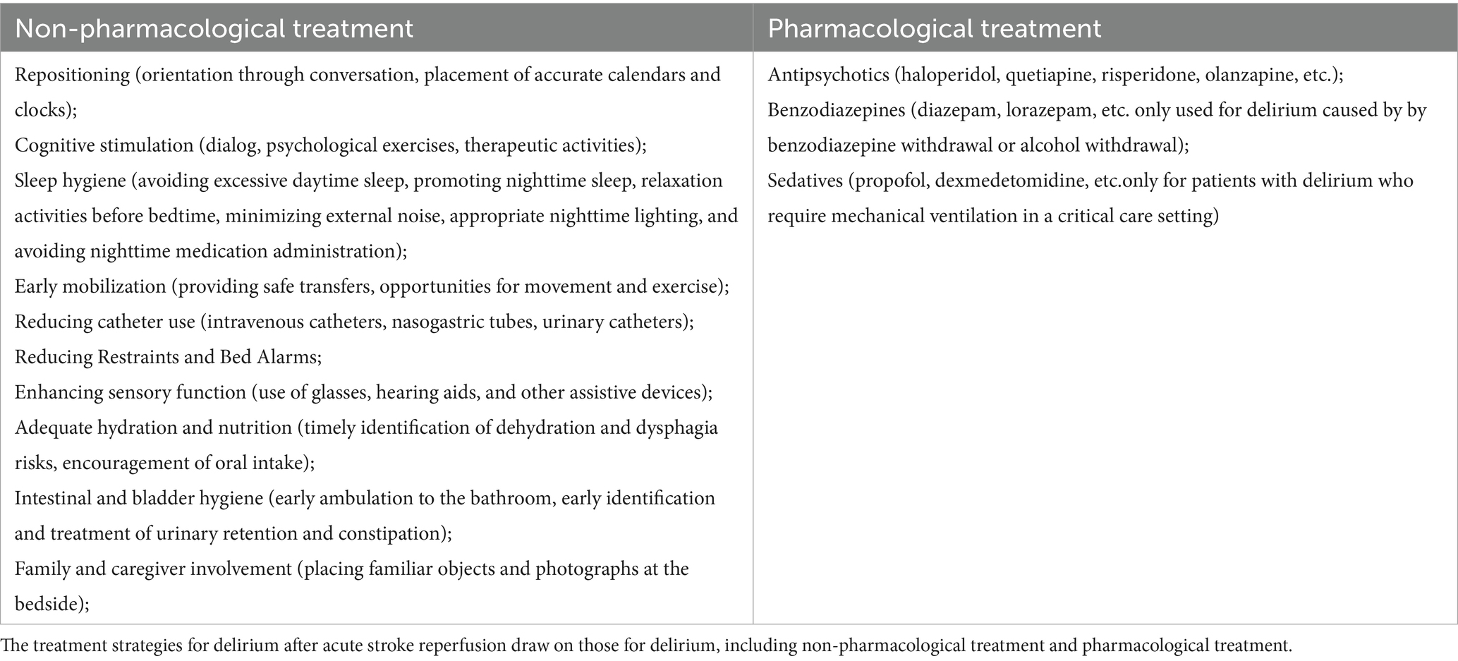 Several systematic reviews have evaluated the treatment of delirium in hospitalized patients, concluding that antipsychotic medications do not significantly affect the severity of delirium, symptom relief, or mortality and should not be the primary treatment approach (67–69). Thus, the prevailing opinion among domestic experts is that post-stroke reperfusion delirium treatment should focus primarily on addressing precipitating factors, with non-pharmacological interventions being prioritized. Antipsychotic medications may be used to treat delirium with behavioral and emotional disturbances when it causes significant distress, poses a safety risk, or interferes with essential treatments, and non-drug therapies fail. Recommended drugs include haloperidol, quetiapine, olanzapine, and risperidone, starting at low doses and gradually increasing based on improvement and side effects, with treatment lasting 1–2 weeks. Medication can be tapered after delirium resolves for 2 days. During the medication period, it is necessary to monitor for extrapyramidal adverse reactions, electrocardiogram, changes in QT interval and changes in consciousness level. Table 3 showed the treatment strategies for delirium occurrence after reperfusion therapy for acute stroke, including non-pharmacological treatment and pharmacological treatment. Research on delirium treatment/prevention in acute stroke patients receiving reperfusion therapy is limited. This article provides recommendations for non-pharmacological prevention strategies based on existing literature (70). Non-pharmaceutical treatments and specific operations were presented in Table 4.