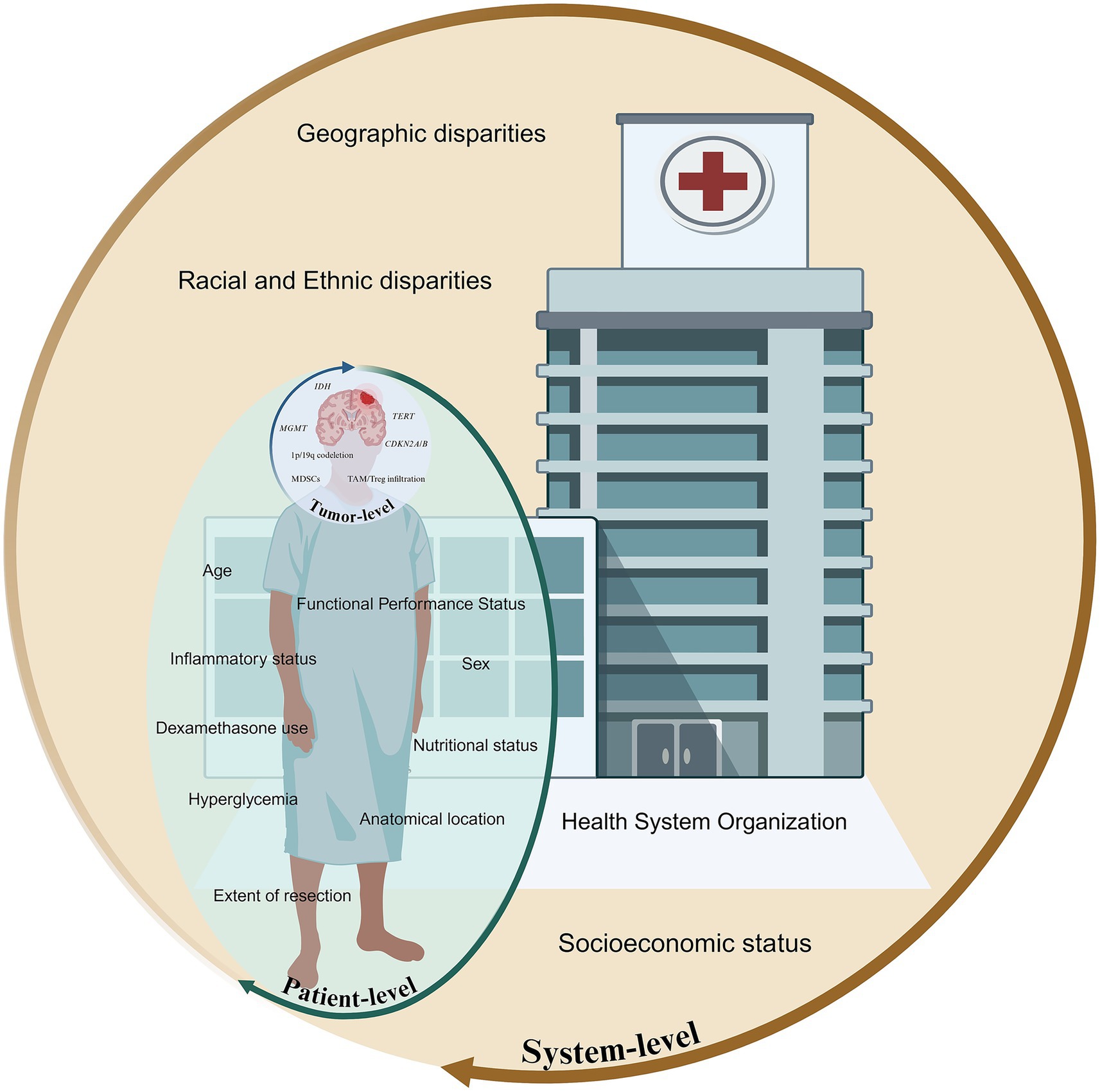 Figure 1. Multiscale framework illustrating tumor, patient, and systemic factors influencing prognosis in high-grade gliomas.