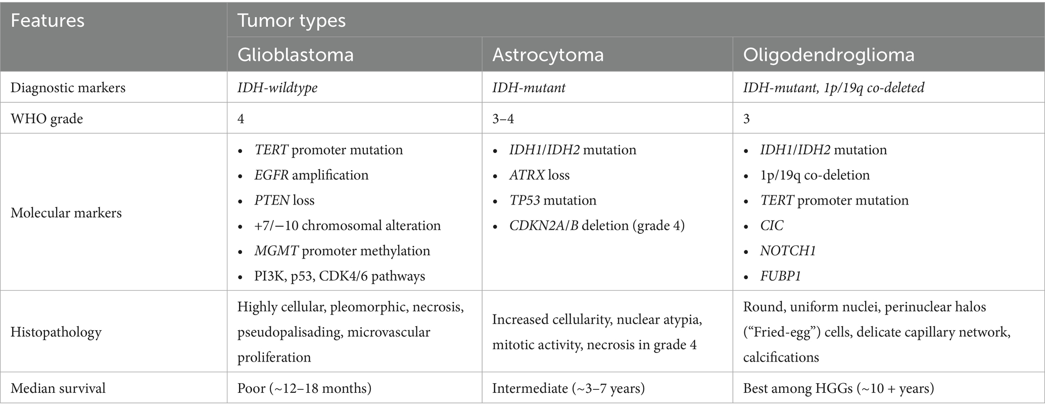 The biological behavior of HGGs was traditionally determined primarily by tumor grade, established by histopathological evaluation. HGGs, particularly grade 4 tumors, are characterized by aggressive histological features, including marked nuclear atypia, frequent mitotic activity, neo-angiogenesis, and necrosis. These morphological hallmarks reflect the biological aggressiveness of the tumor, exhibiting rapid growth, extensive invasiveness, and poor clinical outcomes. Histopathological assessment now represents just one element within the more comprehensive tumor classification framework. Earlier editions of the WHO CNS stratified gliomas into types and grades (1) based on tumor architecture and cellular features. The substantial molecular and clinical heterogeneity observed within the same grade and type led to the integration of molecular diagnostics into the 2016 WHO CNS (5). This update introduced key biomarkers, including1p/19q codeletion for diagnosing oligodendroglioma, and IDH mutation status, along with several other molecular markers and histologic features, to differentiate astrocytoma subtypes. Since then, the adoption of advanced technologies (6) such as next-generation sequencing, RNA expression profiling, and DNA methylation profiling have enabled the discovery and classification of new entities, as well as more precise stratification of existing tumors, culminating in the most recent 2021 WHO CNS fifth edition (1) (2021 WHO CNS5). This revised 2021 WHO CNS5 tumor classification system marked a paradigm shift by fully integrating molecular features into glioma classification and grading, combining traditional histopathological evaluation with key molecular markers (e.g., IDH mutation status, 1p/19q codeletion, CDKN2A/B deletions, and histone mutations) to more accurately reflect the biological prognosis, and predictive therapeutic implications of these tumors (1) (Table 1). It introduces the category of adult-type diffuse gliomas, which is divided into three distinct molecularly defined subtypes: IDH-wildtype Glioblastoma, IDH-mutant Astrocytoma, IDH-mutant and 1p/19q-codeleted Oligodendroglioma.