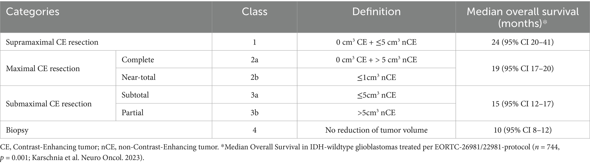 Table 2. The Response Assessment in Neuro-Oncology (RANO) criteria for extent of resection in adult diffuse high-grade gliomas.