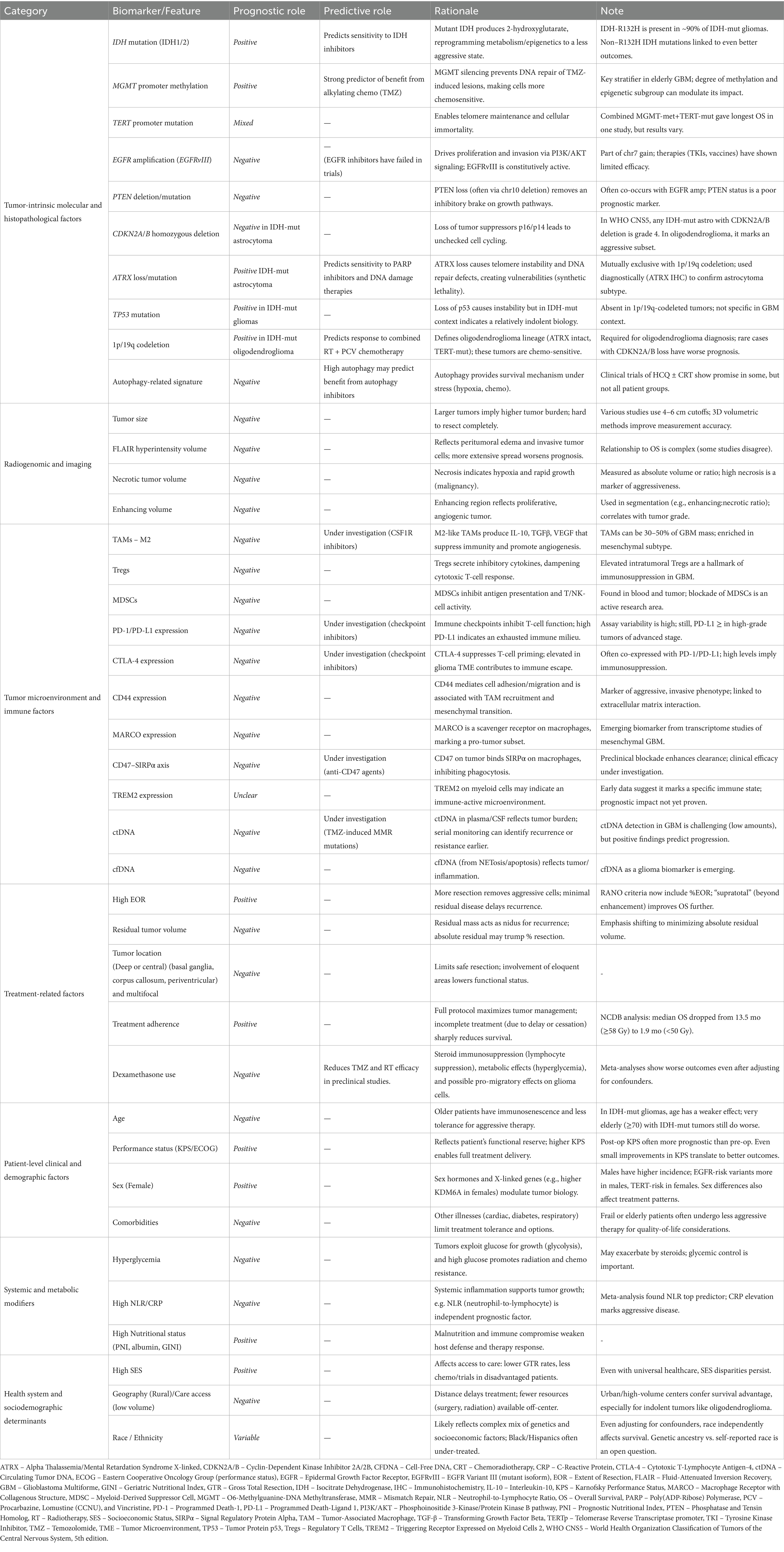 Adult-type diffuse high-grade gliomas (HGGs) are an aggressive group of infiltrative brain tumors, originating from glial cells, including astrocytes, oligodendrocytes, and ependymal cells. Classified as World Health Organization Classification of Tumors of the Central Nervous System (WHO CNS) grade 3 or 4 (1), these tumors exhibit significant malignancy, high recurrence rates, and poor survival outcomes despite aggressive treatment (2, 3). Survival in HGGs is determined by an interplay of histological, molecular, anatomical, and systemic variables (Figure 1), many of which remain incompletely understood or inadequately incorporated into current clinical paradigms. Accurate prognostication is vital for enabling precise prediction of disease trajectory, guides treatment intensity, and supports the selection of appropriate interventions, ensuring care is tailored to each patient’s unique profile. Prognostic biomarkers provide information about the expected clinical course of a disease independent of therapeutic intervention, whereas predictive biomarkers identify patients most likely to derive benefit from a particular treatment (4). In practice, however, these categories frequently converge, with several biomarkers exhibiting both prognostic and predictive significance.