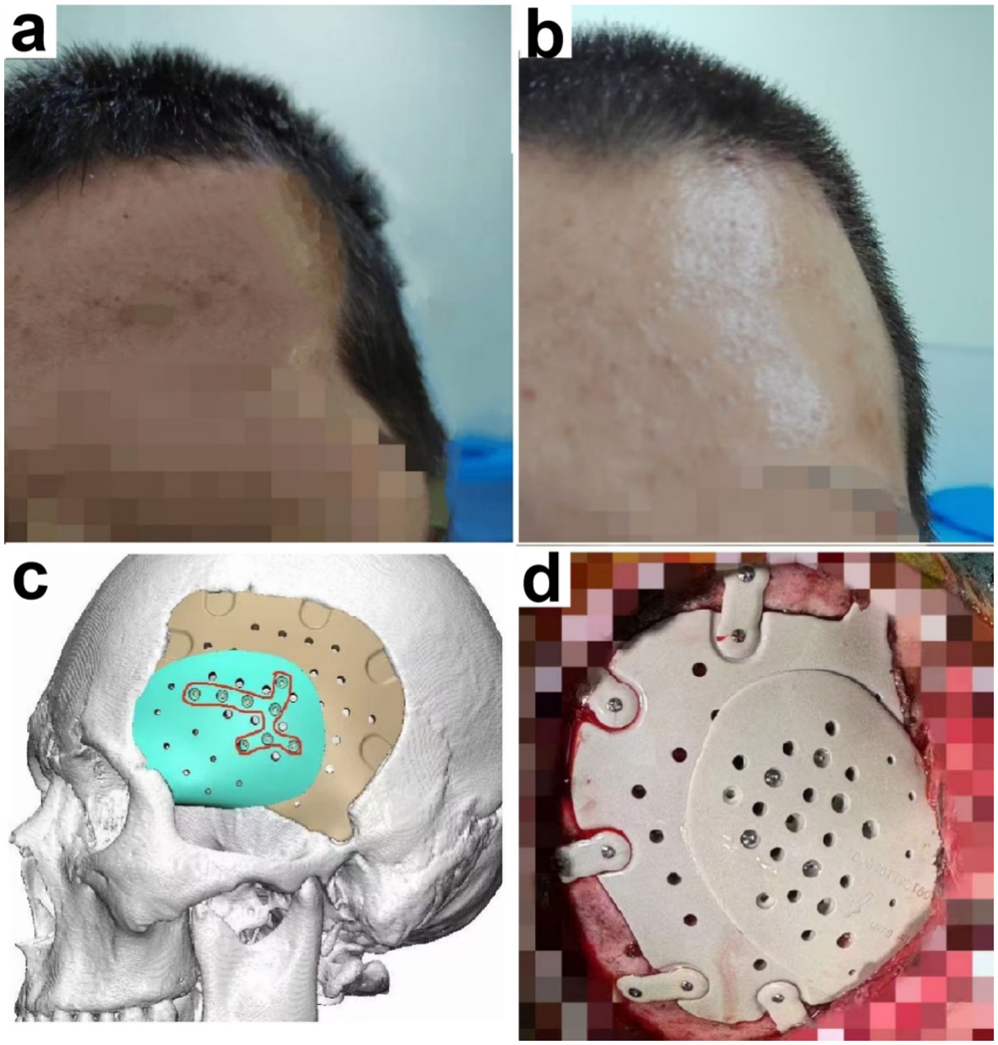 Figure 1. Application of polyetheretherketone temporal muscle prostheses for temporal hollowing following cranioplasty. (a) Pre-operative photos. (b) Post-operative photos. (c) PEEK temporal muscle prosthesis design diagram. (d) Intra-operative photos.