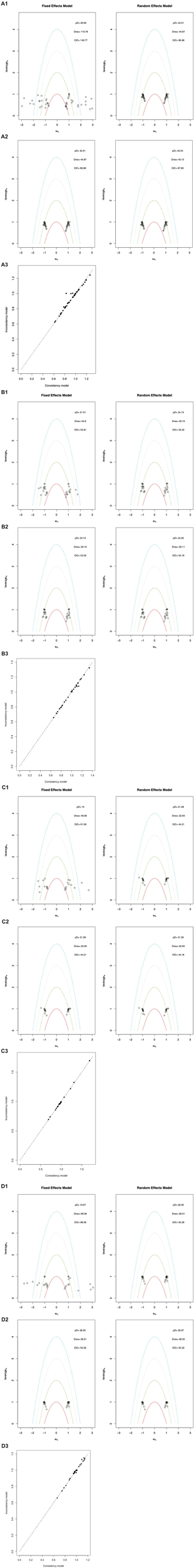 For standard pairwise meta-analysis, we used the I2 statistic to assess statistical heterogeneity, with values over 50% indicating significant heterogeneity. For indirect and mixed comparisons, inconsistencies were assessed at both global and local levels. At the global level, inconsistency was evaluated by calculating the DIC from the inconsistency model and comparing it to the consistency model. A difference of less than 5 between the two models was deemed insufficient to indicate network inconsistency. To assess local inconsistency, leverage plots were created, and the scatter of data points was examined.