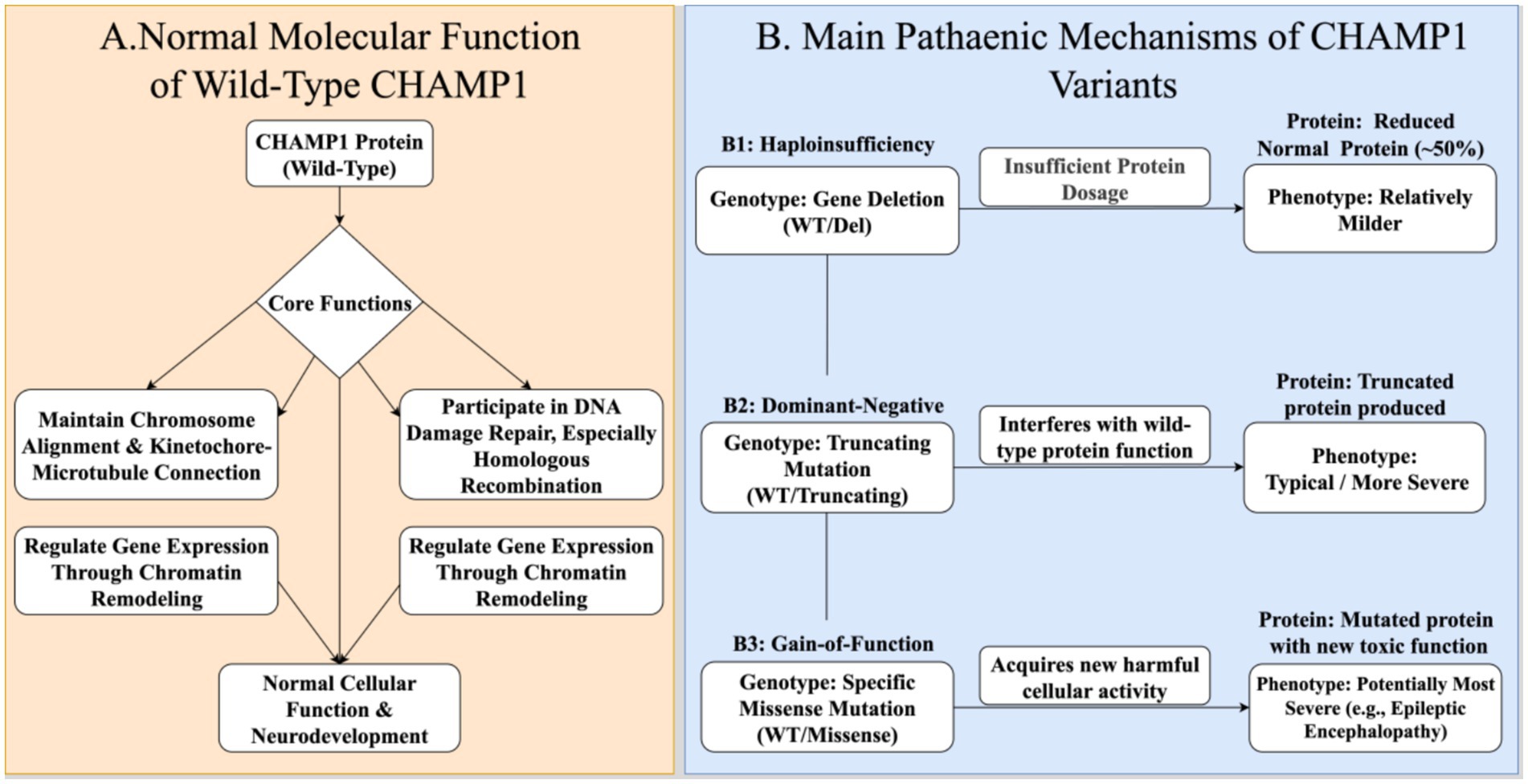 Figure 1. Schematic diagram of the molecular functions of CHAMP1 protein and pathogenic mechanisms of different variant types. This diagram systematically illustrates the intracellular physiological functions of the CHAMP1 protein and the pathological mechanisms induced by different gene variants in CHAND/MRD40. (A) Normal Molecular Functions of Wild-Type CHAMP1. Under normal physiological conditions, the wild-type (WT) CHAMP1 protein acts as a key regulatory factor in the cell nucleus and exerts three core functions: (1) During mitosis, it precisely regulates the attachment between kinetochores and microtubules to ensure the correct segregation of chromosomes; (2) It participates in the homologous recombination repair pathway of DNA double-strand breaks to maintain genomic integrity; (3) As a component of protein complexes (e.g., the CHAMP complex), it is involved in chromatin remodeling and the regulation of key gene expression. These basic functions collectively ensure the normal physiological activities of cells and are particularly crucial for the complex developmental process of the nervous system. (B) Main Pathogenic Mechanisms of CHAMP1 Variants Heterozygous variants of the CHAMP1 gene can cause disease through at least three distinct molecular mechanisms, and different mechanisms may correspond to clinical phenotypes of varying severity: (B1) Haploinsufficiency. This mechanism is typically associated with large-fragment deletions involving the CHAMP1 gene. In this case, the deletion of one allele reduces the total amount of fully functional CHAMP1 protein to approximately 50% of the normal level. Although this reduction in protein dosage is sufficient to cause disease, the resulting clinical phenotype is usually relatively mild. (B2) Dominant-Negative Effect. This mechanism is mainly associated with truncating mutations (e.g., nonsense mutations or frameshift mutations) that lead to premature protein termination. These mutations not only prevent one allele from producing full-length functional proteins but also result in truncated proteins that may retain partial structural domains. Consequently, these truncated proteins can abnormally bind to or sequester normal proteins or other interacting molecules, thereby interfering with and inhibiting the function of normal CHAMP1 proteins derived from the wild-type allele. This “disruptive” effect is considered the main cause of more typical and severe clinical phenotypes. (B3) Gain-of-Function. In rare cases, specific missense mutations may endow the CHAMP1 protein with a novel, cell-toxic function. This abnormally acquired function actively disrupts the normal physiological processes of cells and may lead to the most severe clinical phenotypes, such as early-onset epileptic encephalopathy mentioned in some reports.