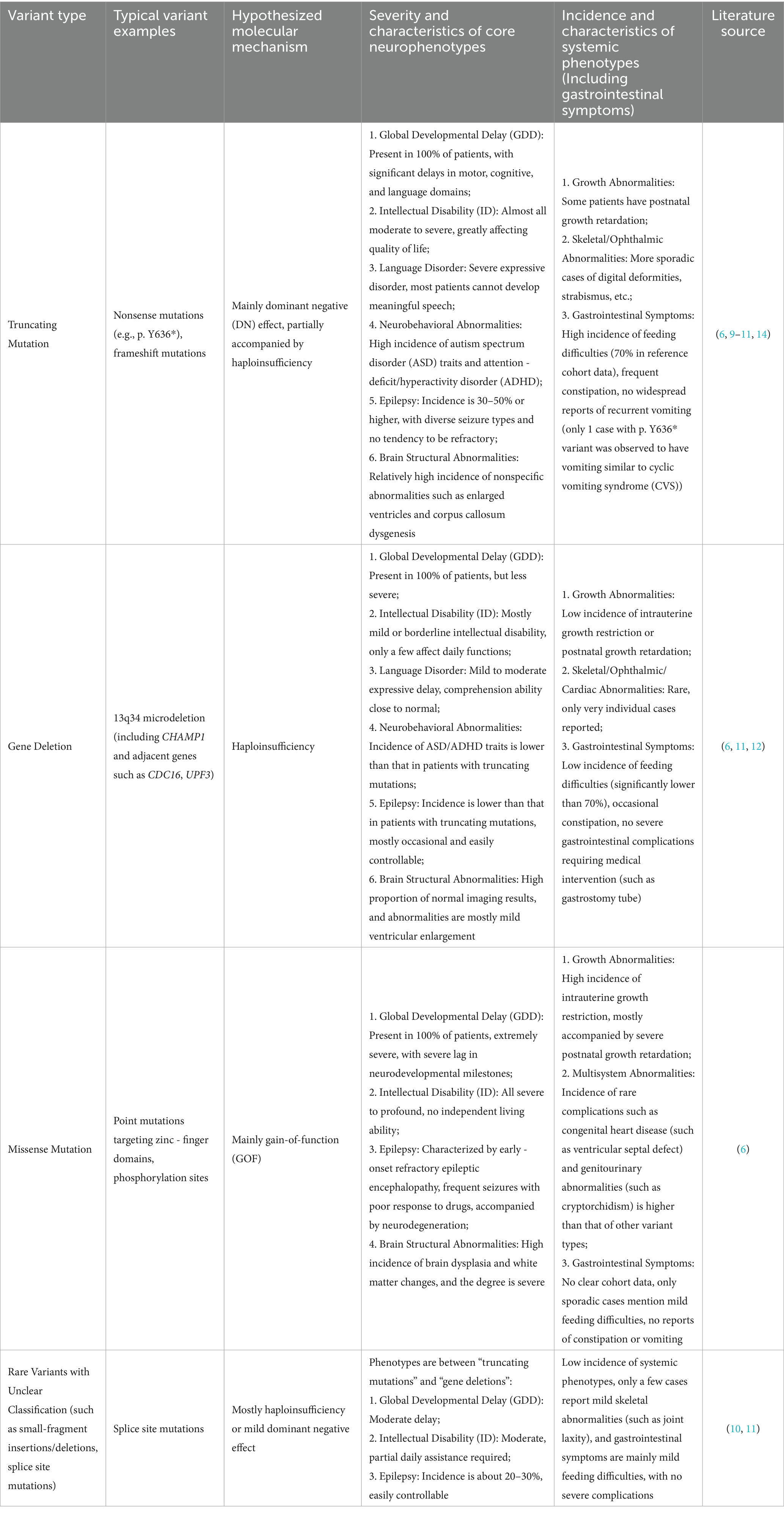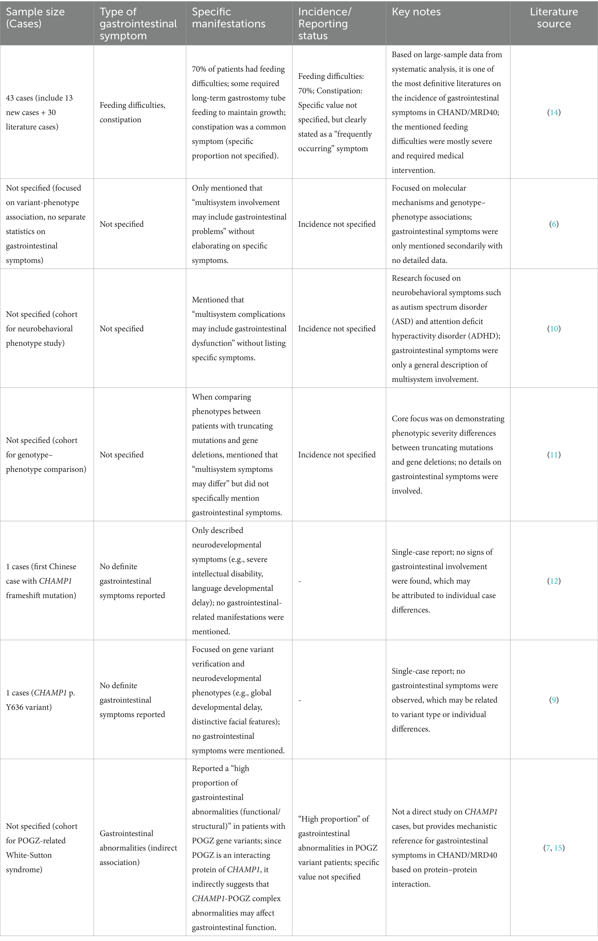 Gastrointestinal (GI) symptoms are emerging as common comorbidities in CHAMP1-related disorders. Garrity et al. (14) systematically analyzed 43 individuals with CHAMP1 variants (13 new cases + 30 literature cases of CHAND/MRD40) and found GI symptoms in a high proportion: 70% had feeding difficulties, with severe cases requiring long-term gastrostomy tube feeding for growth maintenance. Constipation was also a frequent symptom (14). Phenotypic analysis of White-Sutton syndrome (caused by POGZ variants, a CHAMP1-interacting protein) showed high rates of GI abnormalities (functional/structural), indirectly suggesting that CHAMP1-POGZ complex integrity is critical for GI function in CHAND/MRD40 (15). Despite growing attention, systematic large-cohort studies on the incidence and clinical characteristics of specific GI symptoms (e.g., vomiting, gastroesophageal reflux) and their association with CHAMP1 variants are lacking (Table 2).