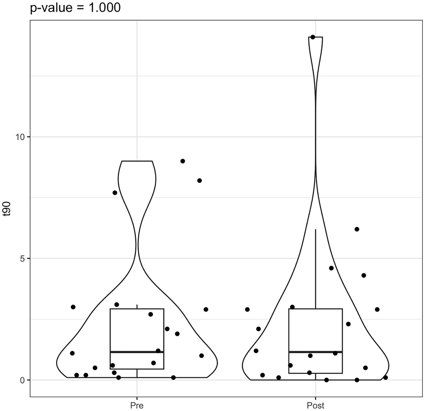 Violin box plot t90 pre/post rehab.