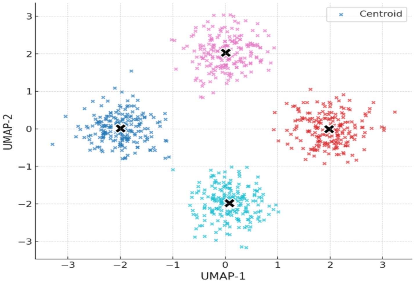 Nonlinear dimensionality reduction with UMAP was used to map the high-dimensional EEG features into a 2D space. Figure 5 illustrates the resulting embedding, with clusters obtained using K-Means clustering (k = 4), on which we observe that the four clusters are well-separated and internally consistent, that is, meaningful latent structure characterizes the pre-ictal EEG signals.