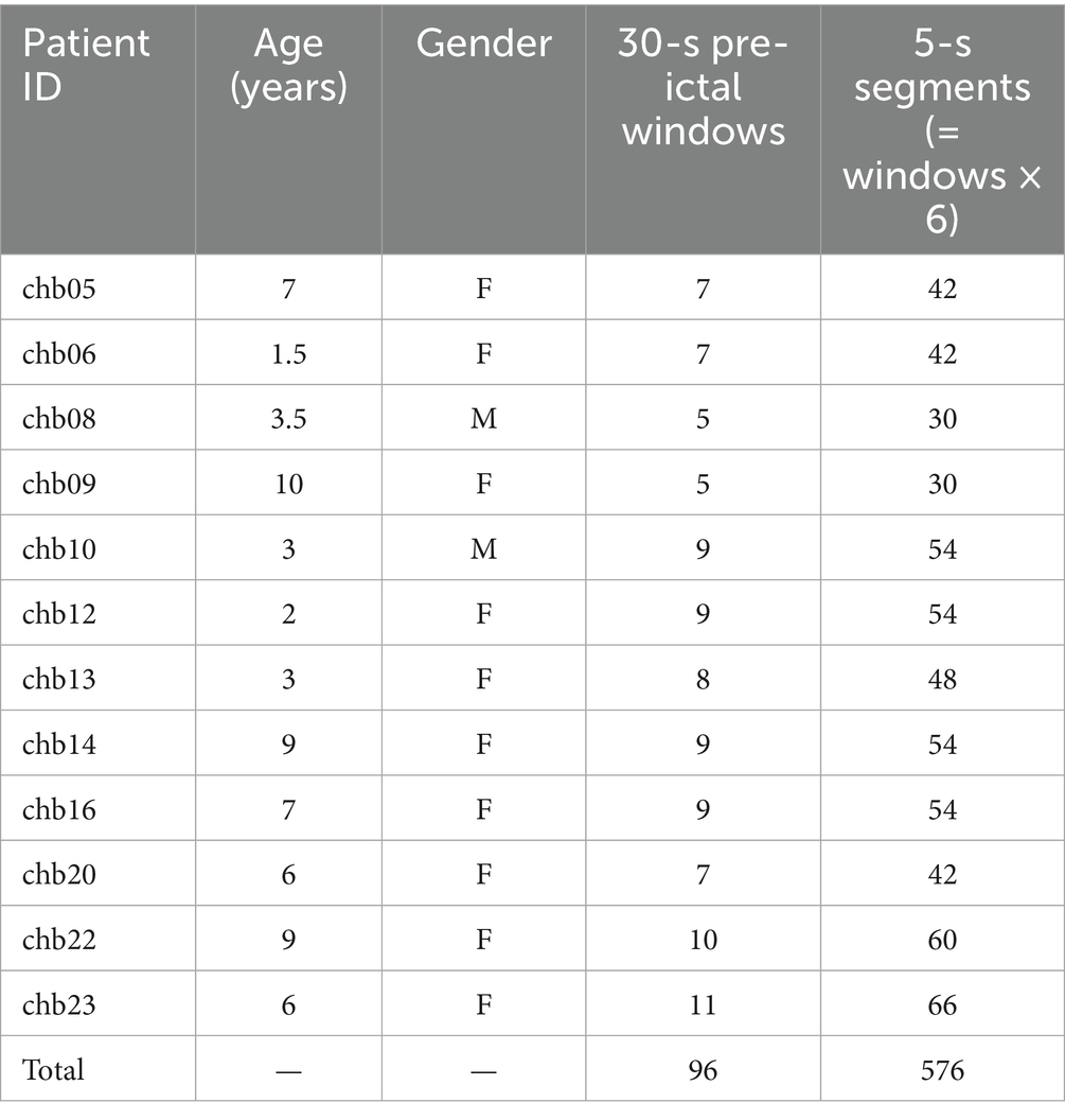 The CHB-MIT Scalp EEG Database was used, a widely accepted resource for pediatric epilepsy research (12). The study selected 12 patients and extracted 30-s pre-ictal windows before seizure onset, as annotated by clinical experts. Each window was divided into six non-overlapping 5-s segments with 576 samples. This segmentation strategy balances temporal resolution and computational tractability, consistent with earlier studies in seizure prediction (13, 24).