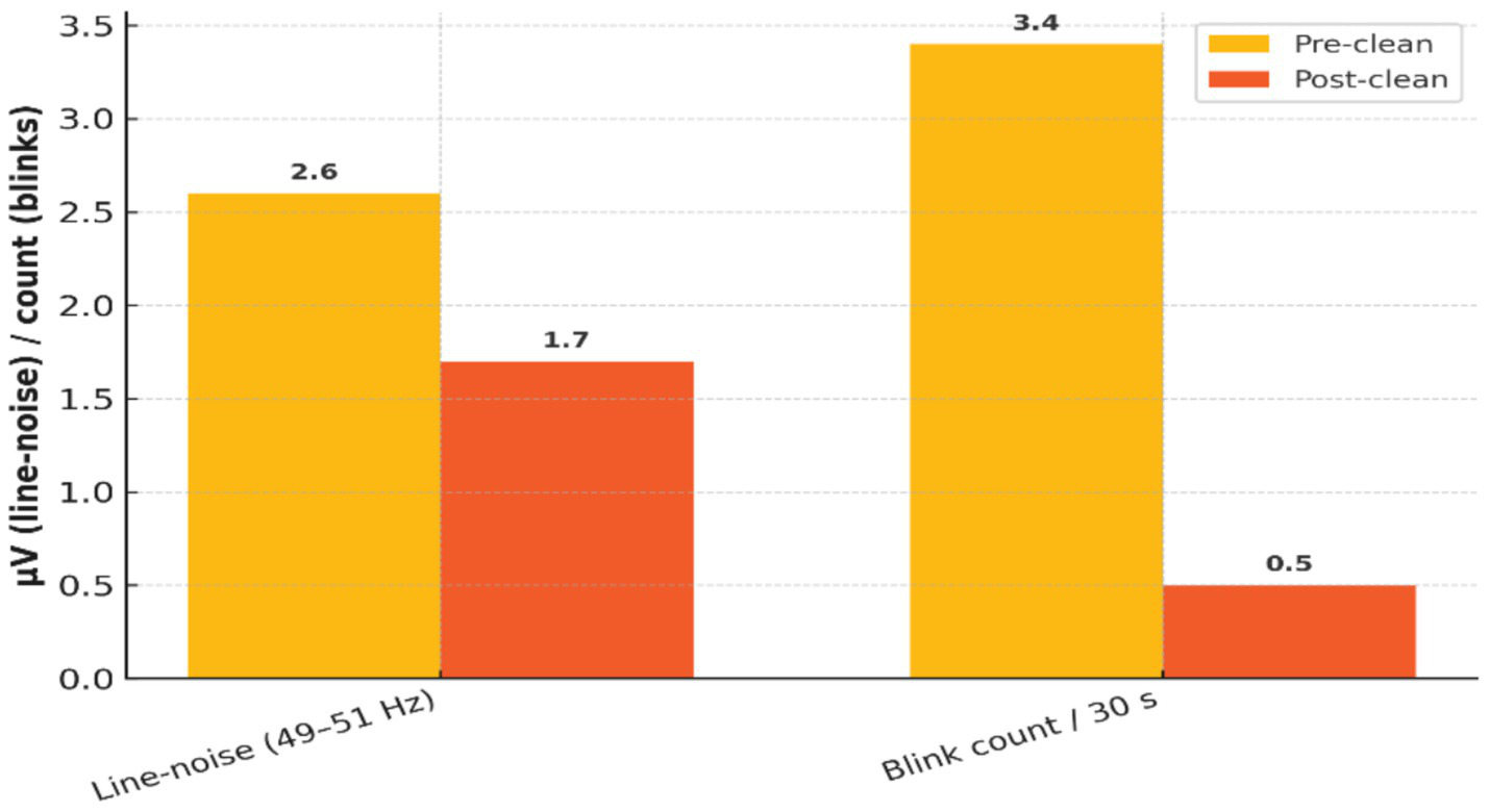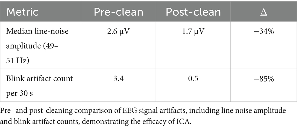 Independent Component Analysis (ICA) was applied to reduce physiological and environmental artifacts. Table 3 quantifies the impact of ICA, with a 34% reduction in median line-noise amplitude and an 85% reduction in blink artifact frequency. Figure 4 provides a visual comparison of EEG traces before and after ICA cleaning, illustrating significant improvements in signal quality.
