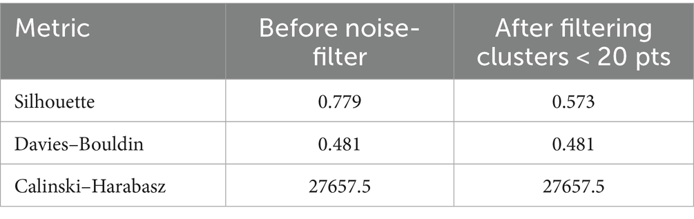 To guarantee the robustness of the clustering results without being influenced by the noise. The study calculated three classical metrics: Silhouette Score, Davies-Bouldin Index, and Calinski–Harabasz Score. These measures assess internal cluster cohesion, external cluster separation, and overall dispersion shape (21, 22). Clusters with fewer than 20 points were removed, while stability across runs hardly deteriorated, underlying the reliability of the clustered assignments.
