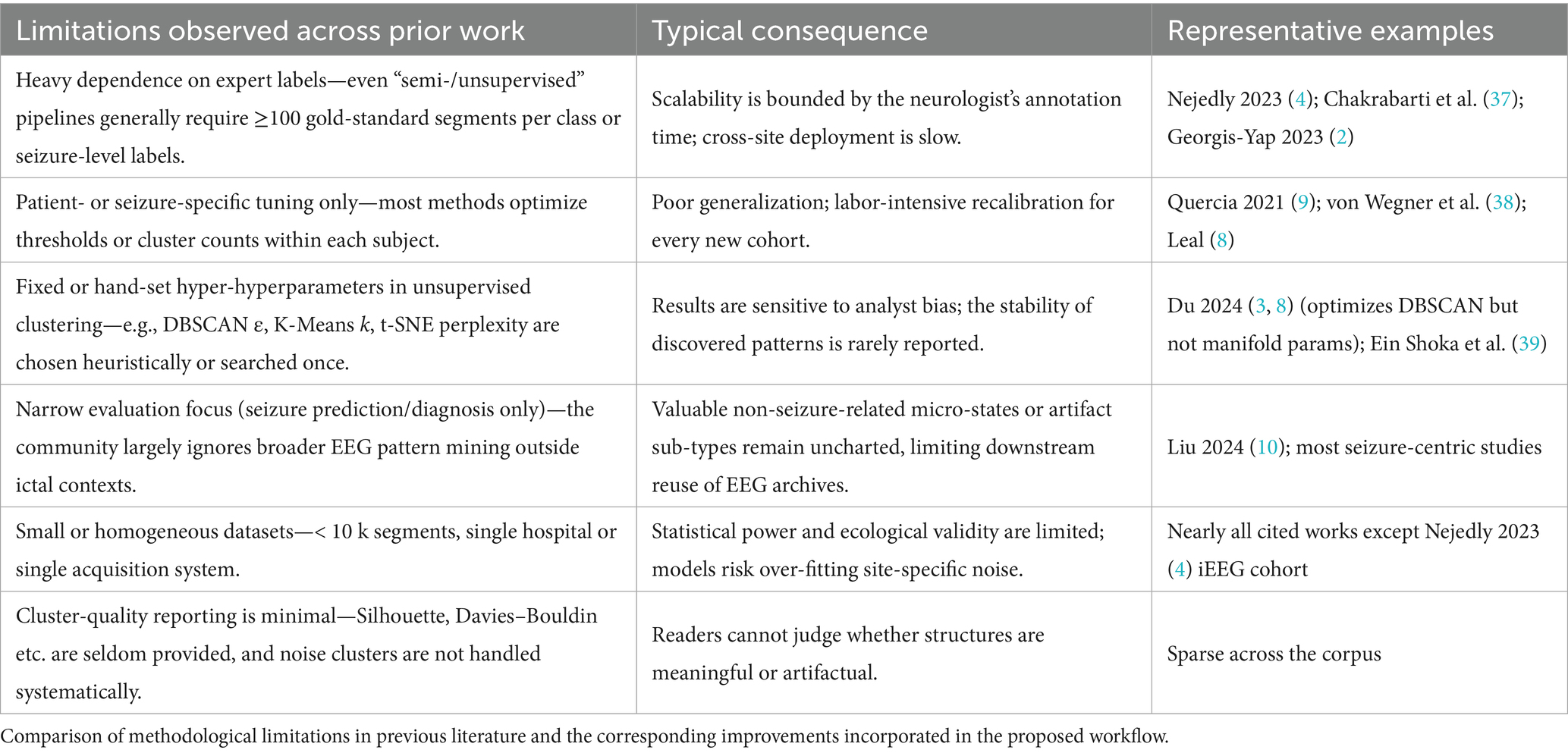 Table 6 highlights key limitations of previous unsupervised EEG studies and summarizes how the study’s proposed pipeline addresses them. These include avoiding manual parameter tuning per subject, eliminating the need for expert-labeled training data, and systematically reporting clustering quality—factors that collectively enhance reproducibility and scalability.