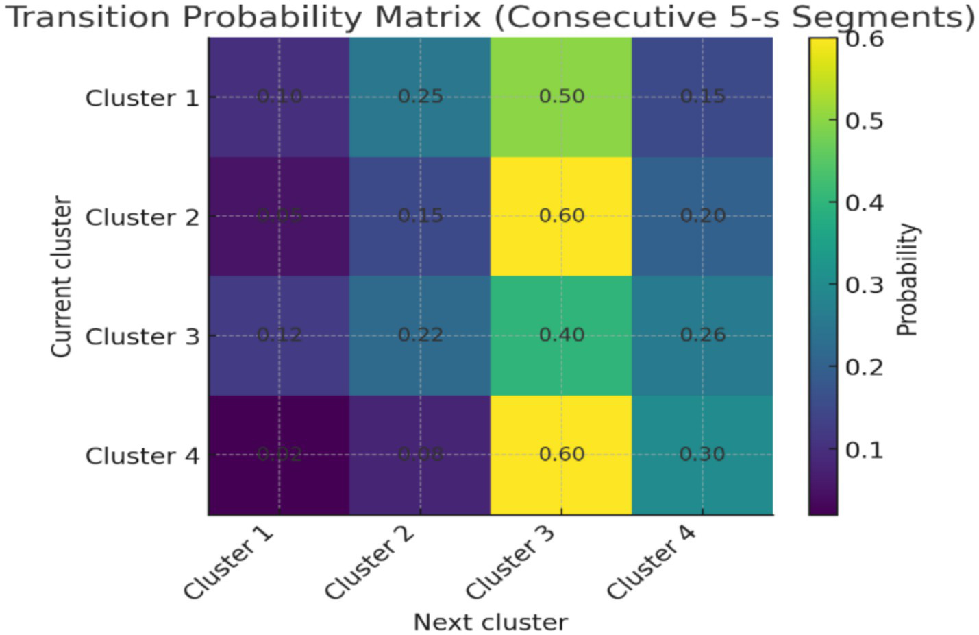 To explore whether the identified clusters reflect sequential dynamics rather than isolated categories, we conducted a minimal temporal analysis. Cluster assignments for consecutive 5-s segments within each 30-s pre-ictal window were examined. Transition probability matrices were computed to quantify how often each cluster was followed by another across time. In addition, a simple moving-average smoothing (window length = 2 segments) was applied to the cluster sequence to reduce spurious fluctuations. These exploratory analyses were intended to provide initial evidence that the unsupervised clustering framework can be extended toward temporal modeling.