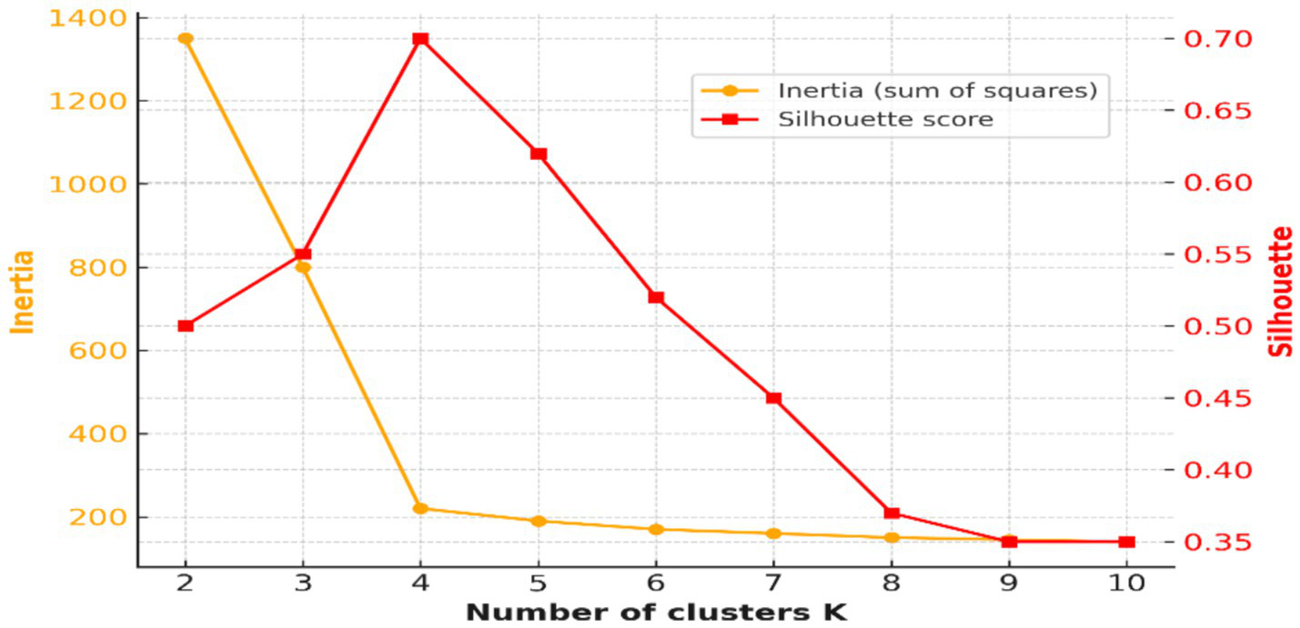 The Elbow Method and Silhouette Score analysis were employed to identify the best number of EEG clusters. Figure 4 shows both measures, and overall k = 4 results in the best clustering in terms of simultaneously its compactness and separation between clusters.
