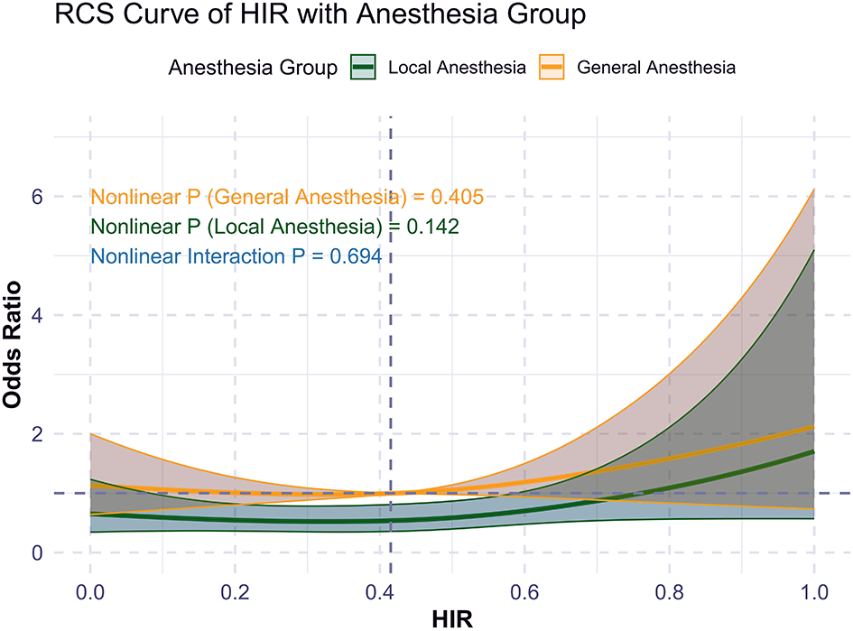 RCS curve of HIR and primary outcome (mRS 0-2) by anesthesia choice.