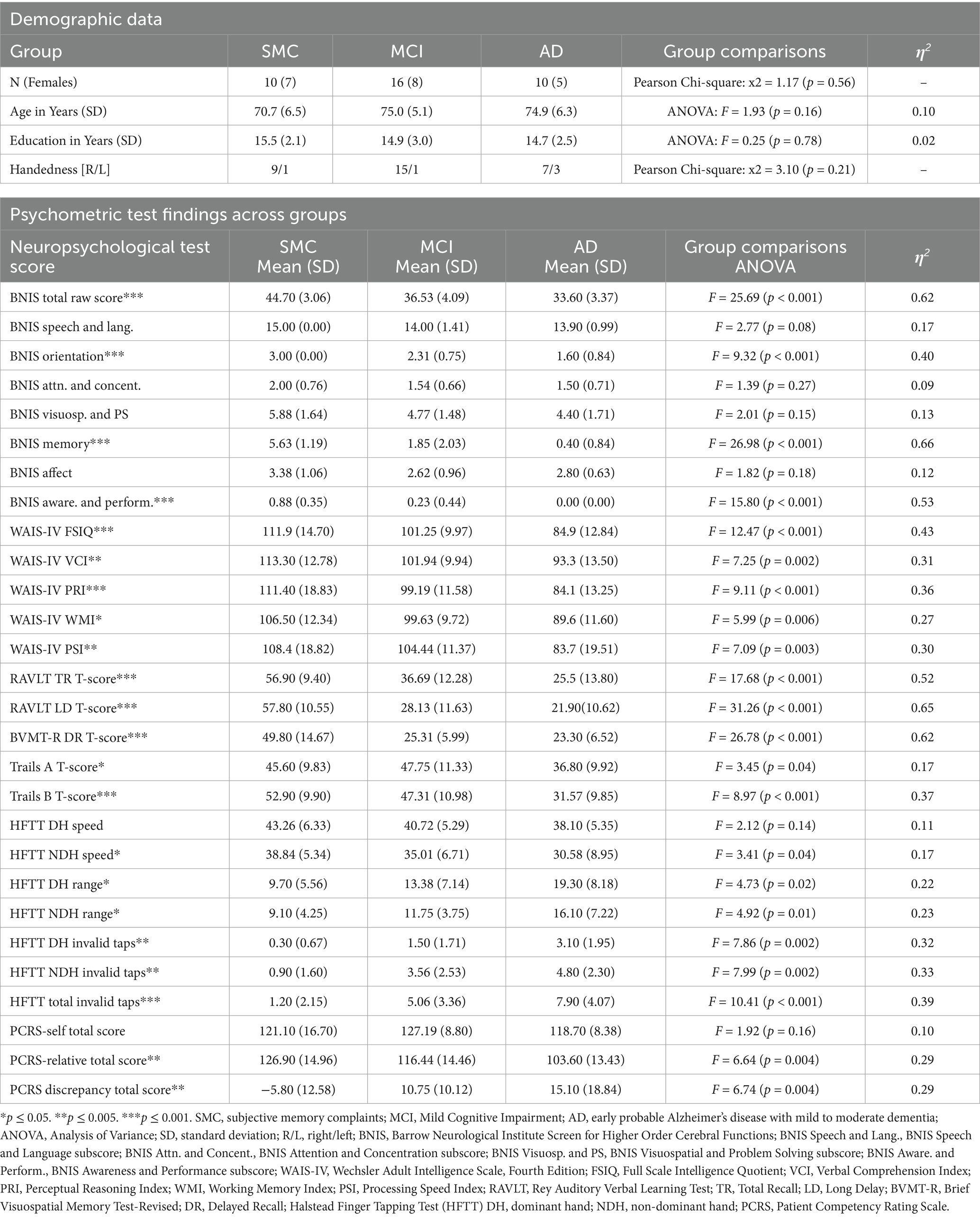 Given the diagnostic criteria for each of the three patient groups, there were expected significant differences in performance levels found on cognitive and motor measures across the SMC, MCI, and AD groups (Table 1). Groups differed on the BNIS Total Raw Score [F(2, 32) = 25.69, p < 0.001, η2 = 0.62], with the SMC group achieving the highest scores [mean ± standard deviation (SD) = 44.70 ± 3.06], followed by the MCI (36.53 ± 4.09) and AD groups (33.60 ± 3.37); the BNIS Orientation subtest score [F(2, 28) = 9.32, p < 0.001, η2 = 0.40], with the SMC group scoring perfectly (3.00 ± 0.00), while the MCI and AD groups showed lower scores (2.31 ± 0.75 and 1.60 ± 0.84, respectively); the BNIS Memory subtest score [F(2, 28) = 26.98, p < 0.001, η2 = 0.66]; and the BNIS Awareness and Performance subtest score, with the AD group exhibiting the lowest scores [F(2, 28) = 15.80, p < 0.001, η2 = 0.53].