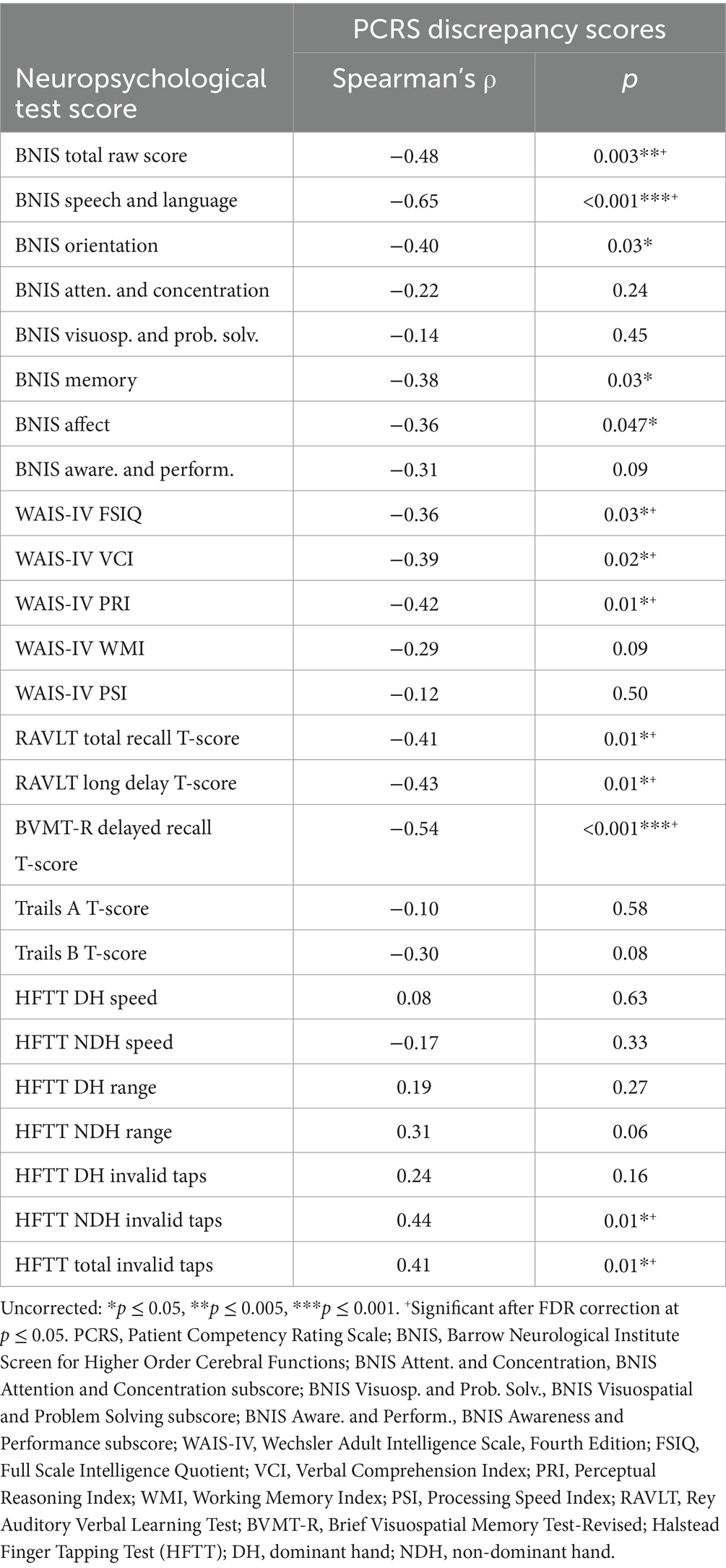 Table 3 lists the correlations between the various neuropsychological test scores and the PCRS versus PCRS-R discrepancy scores. The BNIS Speech and Language subtest, which includes basic mathematical tasks, demonstrated a strong negative correlation (ρ = −0.65, p < 0.001). Greater overestimation of functional abilities was associated with poorer performance on speech, language and calculation tasks. While initial analyses indicated significant associations for the BNIS Orientation (ρ = −0.40, p = 0.03), Memory (ρ = −0.38, p = 0.03), and Affect subtests (ρ = −0.36, p = 0.047), these did not remain significant after applying the FDR correction. Lower BNIS Total score was also associated with greater overestimation of functional abilities (ρ = −0.48, p = 0.003).