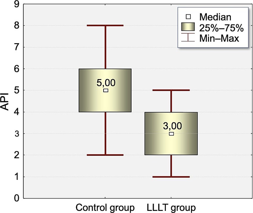 At T0, the API index was significantly higher in the control group (3.75) compared to the LLLT group (2.65, p < 0.0005). This difference increased on T5 (4.87 vs. 3.2, p < 0.0003).
