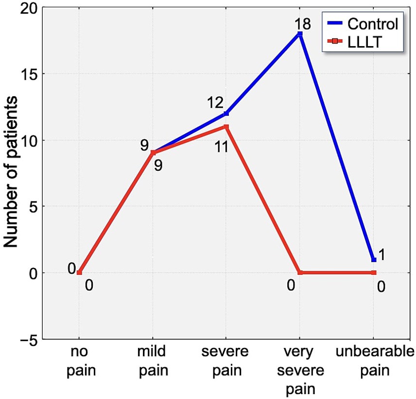To ensure an accurate assessment of pain intensity, we separately evaluated the phototherapy group and the control group, which did not receive any pain-relief intervention. Participants were not asked to compare pain levels on different sides of the dental arch, as pain perception can broadly affect overall well-being, potentially leading to unreliable results.