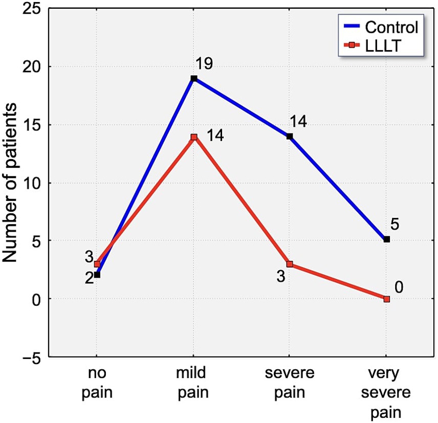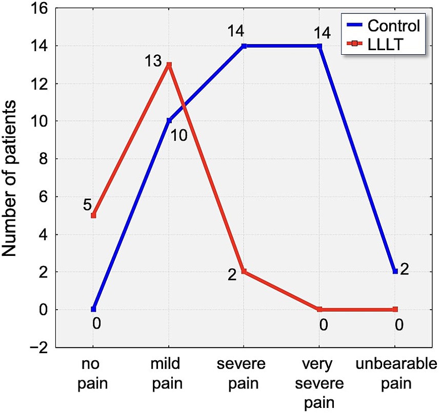 Pain levels were monitored for seven consecutive days, and results demonstrated that patients who underwent laser biostimulation experienced lower pain intensity and shorter pain duration than those in the placebo or control groups. However, LLLT did not affect the time of pain onset or the peak discomfort period (24–48 h post-procedure) (42).