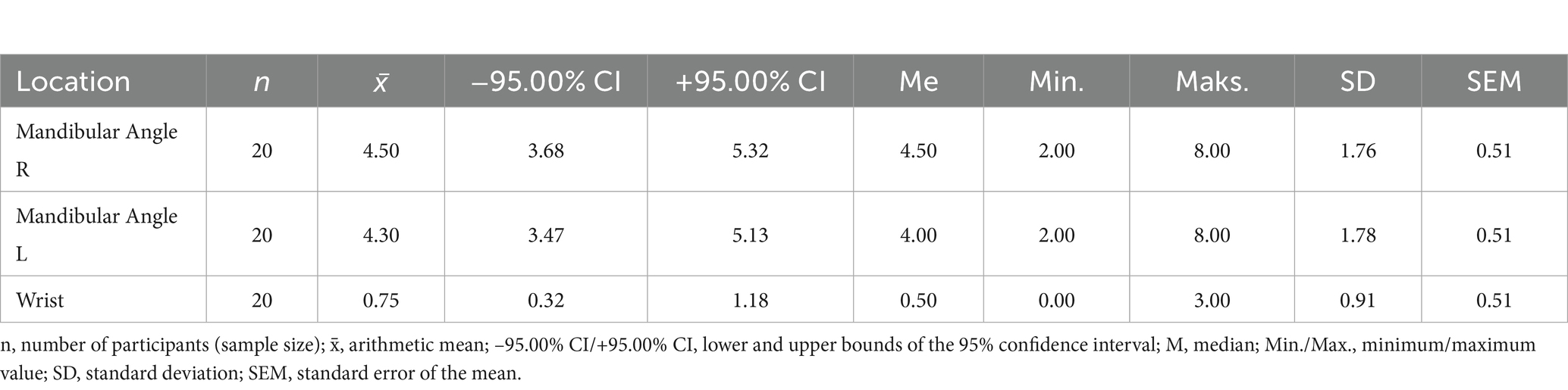 The results of algometric assessment before the placement of fixed appliances (T0), considering three measurement points (right mandibular angle, left mandibular angle, and wrist), are presented in Tables 1, 2.
