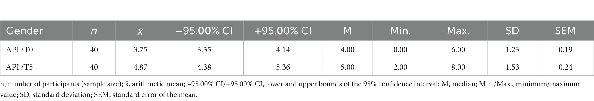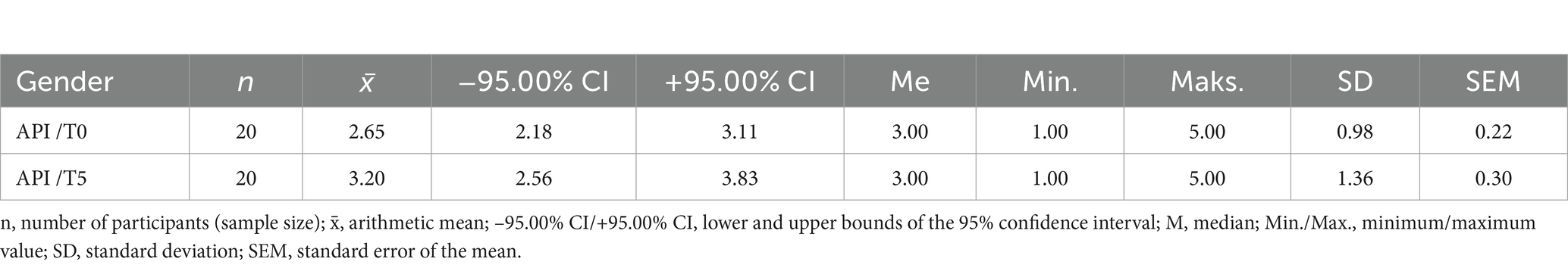 The distribution of Approximal Plaque Index (API) values at the time of appliance placement (T0) and on the fifth day after appliance placement (T5) is presented in Tables 3, 4 and Figures 2, 3.